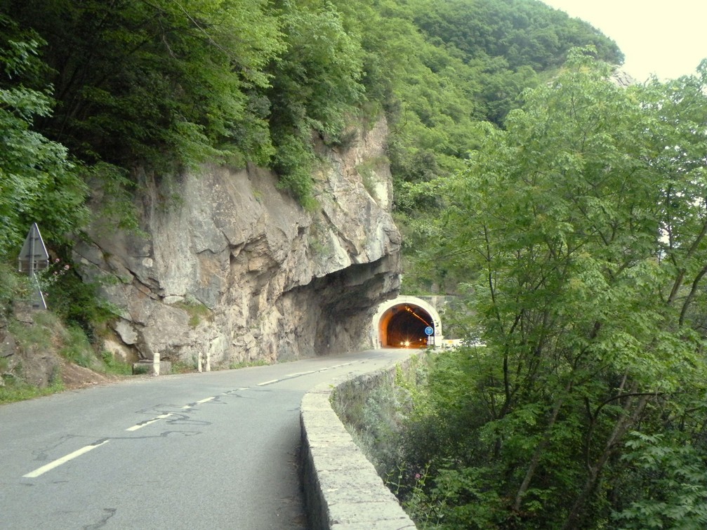 Mám štěstí. Cesta mně skutečně po 300m klesání přivádí přibližně do středu cesty podél kanálu. Tím jsem ušetřil fůru času a jsem u nejatraktivnější části velice rychle. Informace na internetu uvádí různá východiska. Nejčastěji počínají u mostu v Bramafanu, jiné naopak V Gourdonu, či ještě vzdálenějších okrajích. Ty jsou vhodné pro polodenní, či celodenní tůry. Takže brzy narážím kolmo na ocelové roury o průměru 80cm po rekonstrukci v r.1955, předtím 60cm (podle webů). Mně se zdají větší. Nevzal jsem si metr, abych to kontroloval. Třeba se jedná o světlost. Přelézám rouru po betonových schodech a betonovém přechodu. Stojí tu sloup s deskou, odkazující na ochranu zdejší přírody. Takže jsem stoprocentně na správné cestě. Vedle potrubí vede zřejmě ta správná cesta podél kanálu. Rozhoduji se a volím cestu Doprava. Nějakou dobu kráčím lesem a v nejistotě. Nakonec se les rozevře a já vidím nádhernou skalní galerii, kterou stezka téměř po vrstevnici pokračuje. Proto jsem tu. Tady pochopitelně není pro stromy místo. Jen kolmá skála nahoru a pode mnou hlubina s kolmou stěnou dolů. Pěkná hloubka. Aha, proto weby upozorňovaly, že to není cesta pro bábovky se závratí. Naštěstí je na okraji srázu jakés takés zábradlí. Ale čert mu věř. Současně s touto galerií se otevírá pěkný výhled na soutěsku i protější stěnu. Včera dole jsme vysoký vodopád Cascade de Courmes, padající do soutěsky hned vedle silnice ani nezahlédli. Ostatně se tam ani nedalo zastavit. Nyní je vidět ze skalní galerie. Fotím ho teď z druhé strany soutěsky v protisvětle a značným zoomem, takže výsledek Nic moc. Ale všechny později absolvované vodopády v Pyrenejích ho stejně dalece předčily.