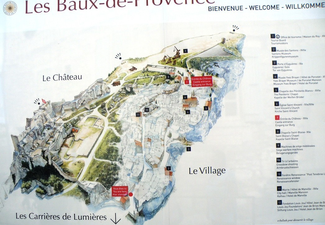 23.5. Provence je kouzelný a zajímavý kraj. Jižní a východní části jsme už provětrali dříve. Nyní ještě budeme zkoumat oblast okolo Les Baux de Provence v Přírodním parku Alpilles plnou bizarních vápencových skal. Město je zvyklé zvládat turistické návaly a to znamená v okolí fůru zákazů zastavení a plná placená parkoviště. Přesto se daří zastavit na cípu země nikoho u křižovatky pod starým městem. Lepší to ani být nemohlo. Pouhých 200m odsud vede přístupová cesta a po dalších 300m stoupání jsme u boční brány historického starého města, také zvaného Mrtvé město. Rovněž atraktivní záležitost. Úzké dlážděné uličky, kamenné domy, butiky, obchůdky. V jednom jsme nakoupili několik pytlíků s provensálským kořením na obšťastnění přátel doma. Kupodivu cena byla nižší, než v jiných městech, či dokonce supermarketu. Z terasy u kostela St.Vincent a kaplí Pénitens Blancs nahoře je výhled na vápencové skalnaté okolní vršky, bránící zahlédnout za nimi známé město Arles. Dál míjíme stánek s obrovskými kvádry tureckých medů. V centru už houfy turistů brání v pořizování fotek. Největší nával je před vstupem do hradu, kterým se také musí projít, chceme-li vidět i druhou horní polovinu ruin na samém vrcholu. Shora je prvotřídní pohled na velkou část Provence. Po sestupu zpět dolů popojíždíme mezi vápencovými skalami s bizarními tvary okolo velmi navštěvovaného Carriéres de Lumiére v jedné z větších jeskyní v původních starých lomech. Staří Římané odtud brali stavivo na hrad a město. Nyní se zde nabízí návštěvníkům stálá audiovizuální show navržená v r. 1976 a od 2012 fungující jako Carriéres de Lumiéres (Katedrála obrazů). Promítají se tu obří jasné obrazy na plochu přes 4000m² hladkých bílých vápencových kamenných stěn a mohutných širokých pilířů, vysokých až 9 metrů. Např. r. 2006 tu byl Paul Cézanne, 2008 byl věnován Vincentu van Goghovi, rok nato Pablu Picassovi. Byla zde výstava Michelangela, Leonarda, Raphaela - mistrů renesance v roce 2015. Letos bezprecedentní mediální akce věnovaná Marc Chagallovi až do 8. ledna 2017. Čtenářům doporučuji aspoň shlédnout zajímavé video na YouTube.