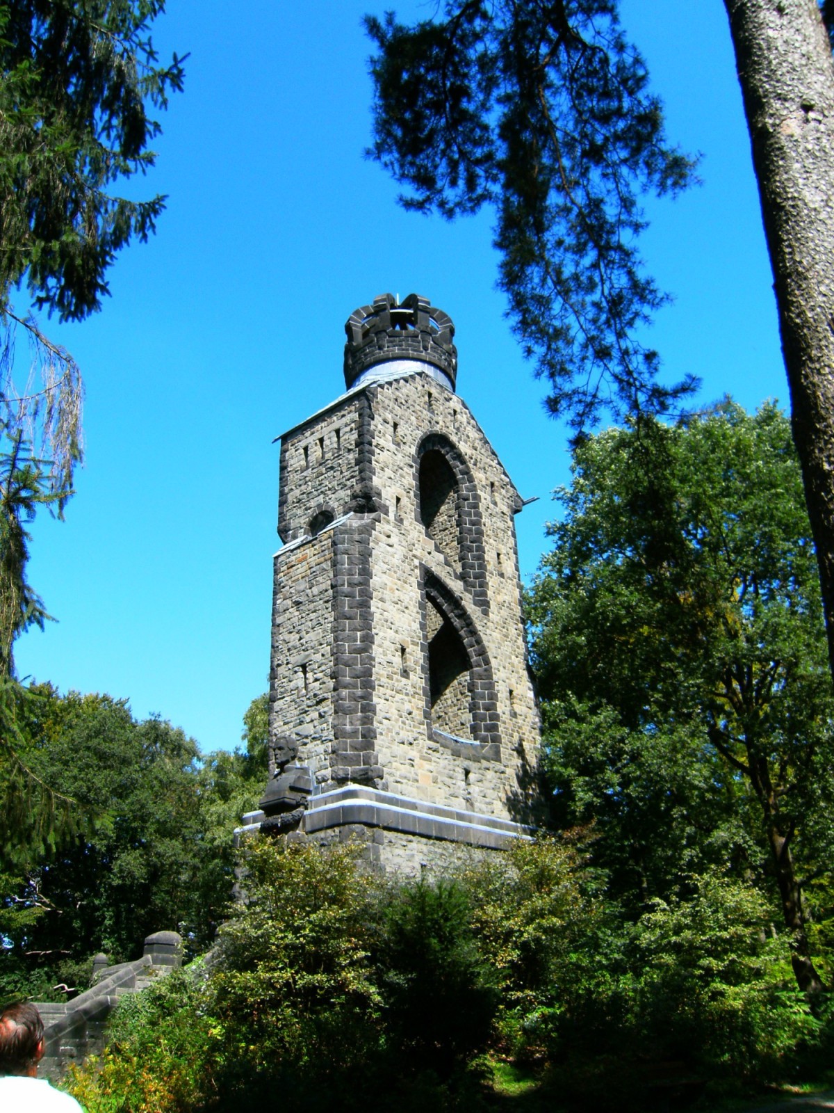 Abychom nemuseli platit drahé přeshraniční jízdenky ráno nás kamarád odvezl autem z městečka Reuver, kde jsme bydleli do Kaldenkirchenu, což je první stanice německých drah za hranicemi. Zde si také kupujeme celodenní Nordhein Westfalen Ticket za 26 Euro a usedáme do regionálního vlaku směr Wuppertal. V Mönchengladbachu přesedáme do dalšího spoje a zhruba po hodině vysedáme na nádraží v Aachen tedy Cáchách. Určitě by se zde dala popsat spousta památek, ale já jako milovník rozhleden mám spadeno na Bismarckovu rozhlednu ve tvaru písmene B. Podle webových stránek by měla být otevřena ve všední dny a v sobotu dopoledne. Stojí v parku poblíž Monschauer strasse. V jízdním řádu městské Dopravy nacházím u linky č. 11 opravdu stanici Bismarckturm, a tak po 10 minutách vysedáme u jedné restaurace na okraji rozsáhlých parků. (Nemusím snad ani říkat, že nám tu v MHD paltí ona síťová jízdenka z vlaku) Jenže ouha, to že by tu měla stát nějaká věž připomíná pouze název zastávky. Vytahuji tedy mapu a spíše intuitivně vcházíme do parků, kolem starého lesného hřbitova. Na první odbočce se jakoby vracíme zpět. Buď ji najdeme nebo ne. Našli jsme, jenže je zavřeno a nikde ani zmínka o provozu této nádhery. Za vtupní mříží se nachází na zdi viditelný zbytek nápisu o ceně vstupného ještě ve fenicích. Tak jen několik údajů, věž byla postavena v letech 1905-1907 podle návrhu architekta Georga Frentzena, a do výše 23 m vede 101 schodů.