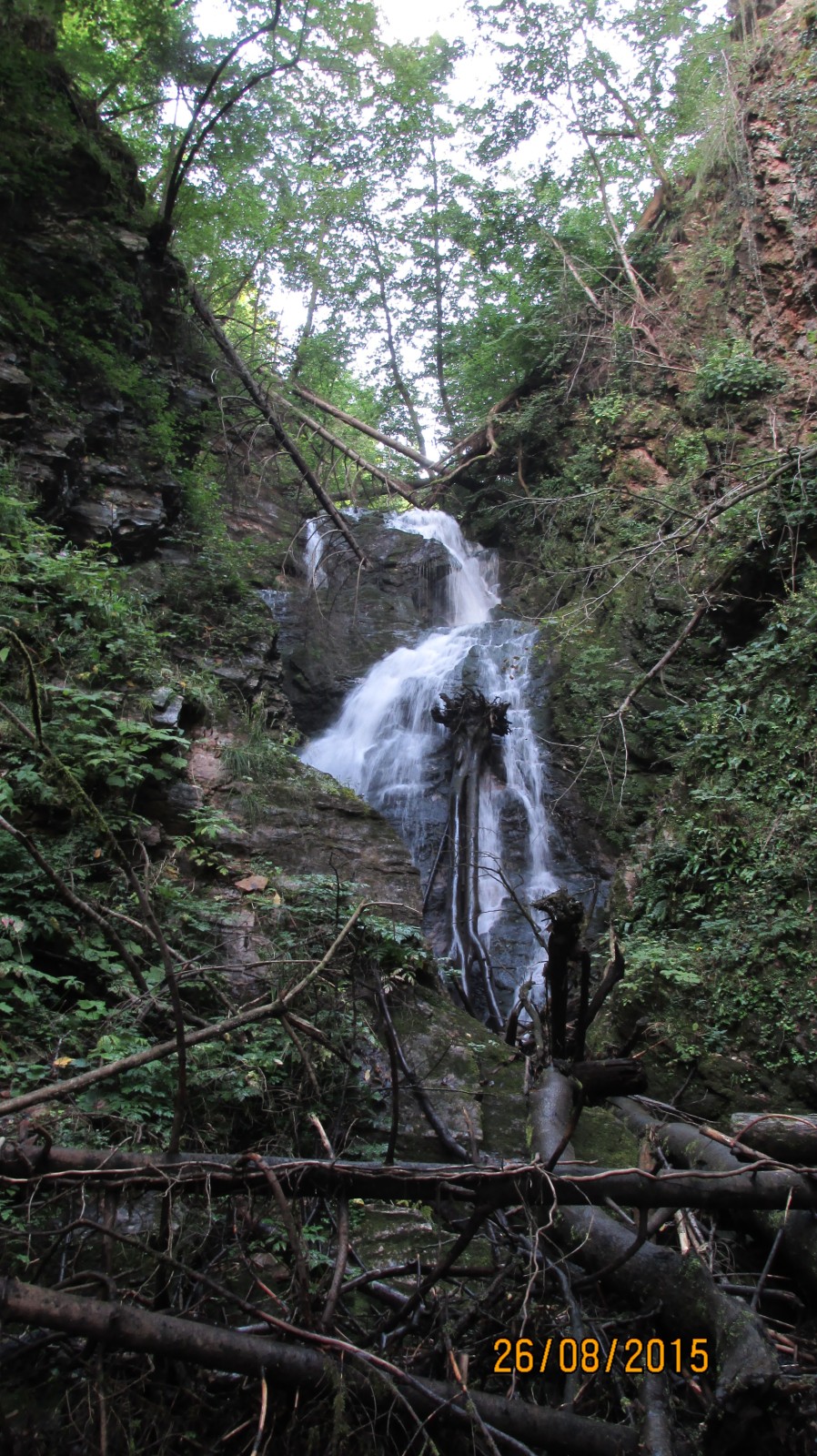 Původně to měla být jen taková odbočka a shlédnutí vodopádu. Když jsme dojeli do vesnice a viděli velkolepou ceduli, stejně jsme nevěděli jestli vpravo nebo vlevo. Jedeme o kus dále a vystoupíme. Jdu jen s Ondrou, vpravo. Po rozbahněné cestě po dřevařích. Za chvíli nás místní domorodec pošle opačným směrem. Vracíme se a po odbočení uvidíme ceduli schovanou v porostu. Dojdeme k lavičce a poté už cesta chráněna zábradlím pokračuje do rokliny, kde má být ukryt vodopád. Zábradlí je spadnuté pod vyvrácenými stromy. Tu si syn vzpomene, že ta paní (u první cedule) říkala něco o přírodní katastrofě. Odhodíme batohy a pokračujeme směrem dolů. Vodopád je podle informace z internetu téměř skryt v rokli a přístupný kdykoli v roce. Doma v bezpečí a pohodlí se skutečně hezky plánují výlety. Tedy informace nelhaly, že je nádherný a téměř skryt. Úplně skryt, protože když ho chcete vidět v celé kráse, musíte vlézt až do potoka. To však v době letošního sucha už byl ten nejmenší problém.