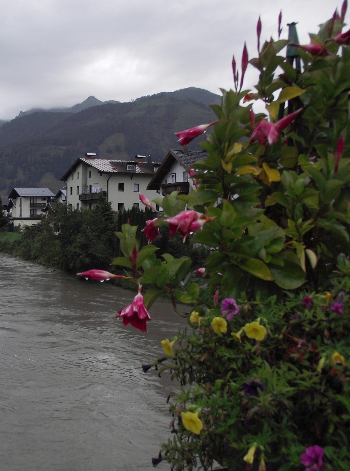 Ráno skutečně lépe bylo – tedy alespoň v tom smyslu, že nepršelo a obloha byla i o něco světlejší. Vyrazil jsem proto rychle do centrální části městečka Bruck an der Großglocknerstraße, abych si alespoň něco nafotil. Koneckonců bylo celkem jasné, že i dnešní den bude hlavně o vodě. A to nejen díky mnoha vodopádům, které jsme měli vidět. Kostel byl zavřený, a tak mi musely stačit exteriéry, nějaké domy a zákoutí nebo zdejší slavný nultý milník. Nejvíce mě ovšem fascinoval rozcestník, na kterém vidéte jména známá všem fandům zimních sportů. Například Bischofshofen nebo Vilach. A k tomu ten „kopeček“, co je součástí názvu tohoto sympatického městečka. Opět silně zalituji absence modré oblohy a sluníčka. Potom nás už čeká snídaně (a zjištění, že s námi v penzionu byla ubytována skupina velmi pěkných mladých osamělých dívek z naší domoviny, které zde cykloturistovaly), po které si ještě jednou odskočím do města a tentokrát už mám štěstí. Neogotický farní a poutní kostel Nanebevzetí Panny Marie tedy navštívím i interiérově. Je otevřeno a uvnitř prázdno, ale vzápětí jsem farářem vykázán, že zde nacvičují jakési oratorium. Nevím sice, co zde kdo skutečně dělal, ale kostel mě nijak zvláště nenadchnul. Rychle doběhnu na hotel, nechám se napomenout manželkou, že jsem nepomáhal při balení (mé tvrzení, že jsem ji chtěl opět nechat vyniknout, se moc neujalo). A vzápětí začne opět mrholit.
