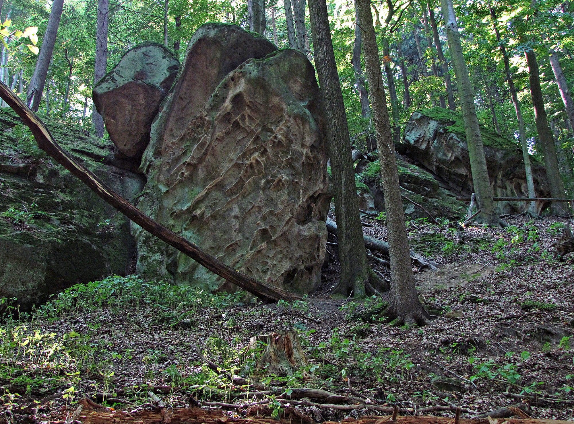 Postupně procházím pod bizarními bloky výraznějších skal, na které ze všech koutů svahu shlížejí další hezky tvarované skalky, stěny nižších mrazových srubů a balvany. Úplně dole jsem znovu zajásal při pohledu na naprosto fantasticky ozdobené skalní stěny a krásnou síť voštin, která tady v Chřibech patří z hlediska geomorfologie k nejhezčím! To vše doplněno nádherným žebrovím křemenných žil a skalních dutin. A ty větší dutiny, zvané tafoni, jsou zase místy k vidění na okolních skalních útvarech.
