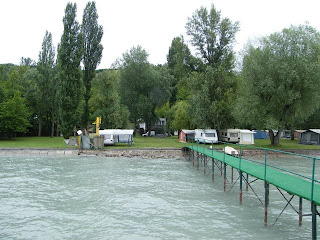 Zobudili sme sa do nedele. Olovená obloha bola stále taká istá, vietor nám fúkal väčšinou do chrbta. Ale po pár kilometrov som dostal ďalší defekt. Bolo to v dedine. Na zastávke autobusu som to opravil a v obchode sme nakúpili. Dážď nám bol v pätách ale nedobehol nás. Za dedinou Czákvár v dlhom stúpaní som dostal ďalší defekt a plášť bol predratý. Super deň. Polepil som , plášť som ofačoval izolačkou a išli sme ďalej. Čo najskôr musím kúpiť nový. Tentokrát sme išli už viacmenej stále dole a dole kopcom. Počasie sa trosku zlepšilo, okolo obeda nás pohladili slnečné lúče, prechádzali sme cez krásnu krajinu, pomedzi polia s dozrievajúcim obilím a repkou. Pred Székesfehervárom sme sa dostali na prvé Cyklotrasy, ktoré nás viedli smerom k Balatónu. Mali sme dnes toho dosť. Ešte raz sme trosku poblúdili a stratili polhodinku, ale keď sme prišli na kruhový objazd pri dedinke Balatonakarattya, pocítili sme silný dotyk turistického priemyslu. Dobre vybavená samoobsluha, trh so všelijakým tovarom a do kempingu 1 km. Nakúpili sme trošku potravín, už sme sa naučili, že je zbytočné kupovať veľké zásoby. Do kempingu sme sa spustili strmým kopcom asi kilometer a zastali sme pri ošarpanej recepcii. Dokázali sme to. Sme na Balatóne.