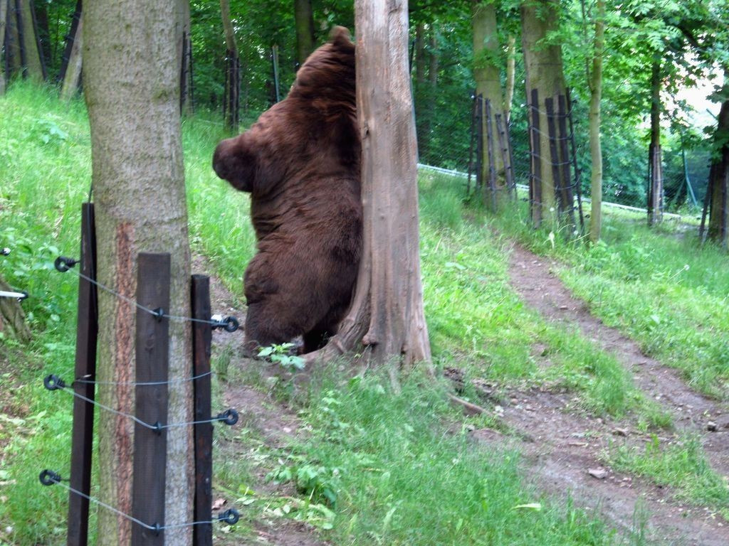 Já šel nejdřív k rozhledně Městská hora, která je asi o sto metrů dál.Za pěkného počasí hezké rozhledy na celé okolí,výška vyhlídkové terasy asi 10m, ale na kopci. Vstupné 12 kč. Pak se vracím k medvědáriu. Je to atrakce hlavně pro děti, je jich tam okolo s maminkami spousta. Huňáči jsou tam všichni tři a pěkně nám vyrostli. Jeden z nich se drbe o strom a vypadá to že kdyby přitlačil tak ho snad vyvrátí. Tak chvíli okukuju a fotím a pak jdu zpátky na náměstí a k nádraží. Tam jdu po modré na most směrem na Tetín.