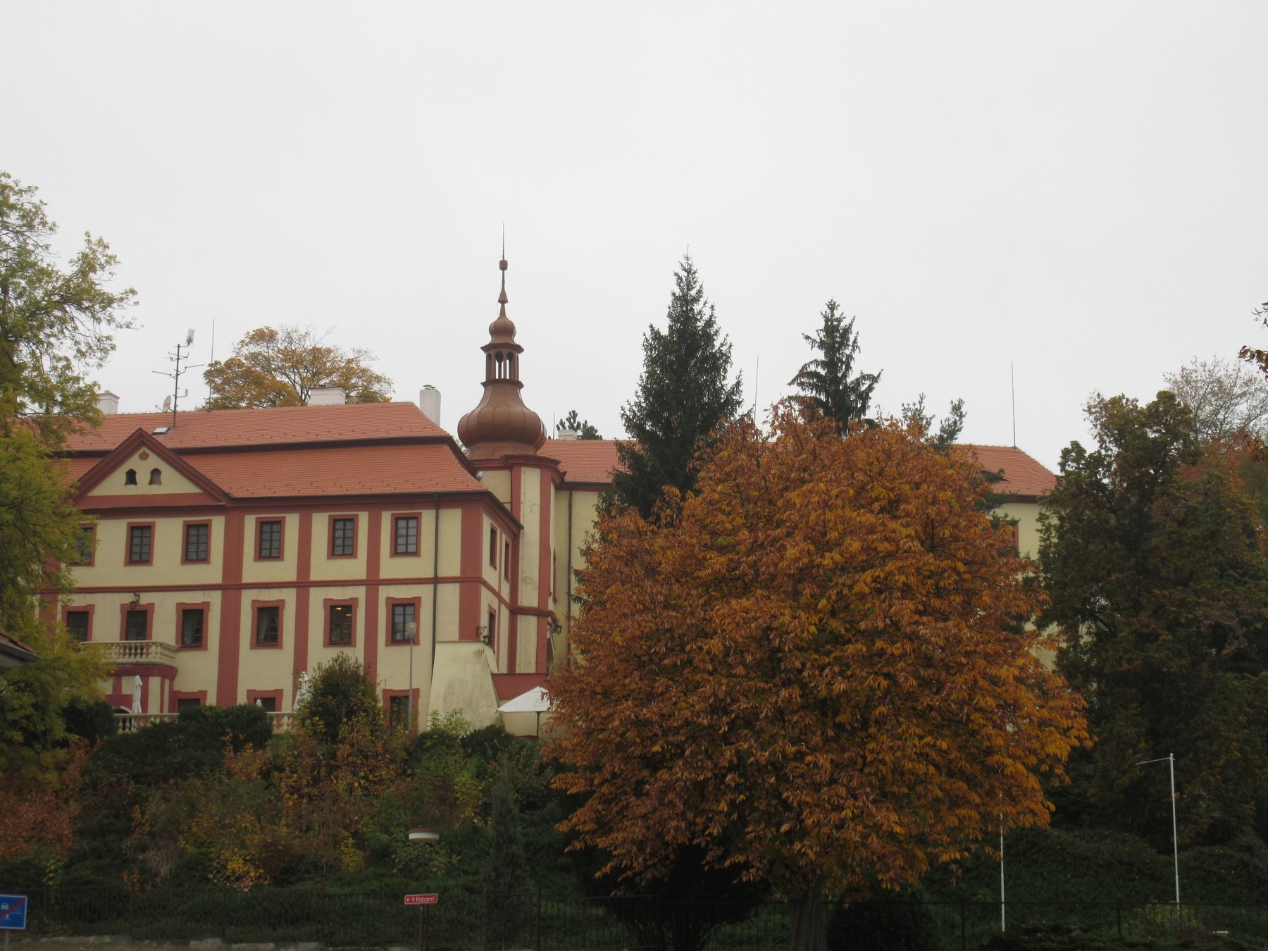 My jsme do města dojeli vlakem – železniční spojení s okolím je již od r. 1901. Okružní naučná stezka, která měří 13,5 km a na které je 13 zastavení s texty v češtině a němčině, začíná na náměstí Kryštofa Haranta (590 m), takže z nádraží je nutno odbočit vpravo a na hlavní silnici se vydat opět vpravo do kopečka po žluté turistické značce. Z náměstí jsme se na hezky opravený zámek jen podívali. Jeho prohlídku jsme neplánovali a zda k němu zajdeme, to uvidíme podle toho, kolik budeme mít času po návratu. Je říjen, je brzy tma, tak s tím ani nepočítáme.