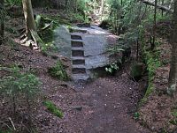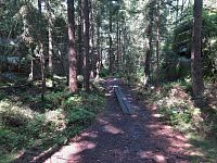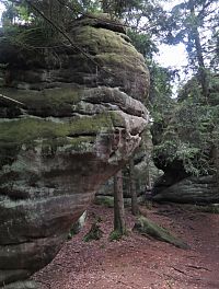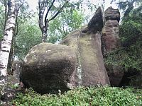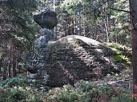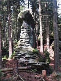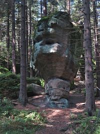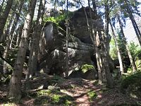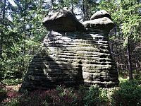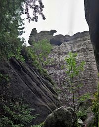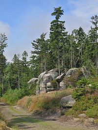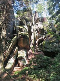 A tak jsme již zanedlouho odstavovali auto na parkovišti ve Slavném, abychom zamířili ke skalnímu městu v okolí Božanovského Špičáku, v němž většina skal připomíná různá zvířátka a jasně rozpoznatelné jsou zde i náznaky skalních hřibů. Nejprve nám dělala společnost žlutá TZ, kterou ale rychle vystřídala ta červená. A bohužel také stále houstnoucí mlha, či spíše velmi nízká oblačnost. I tak jsme si ale neodpustili odbočku ke Slavenské vyhlídce a doufali jsme, že hrdě pohlédneme nejen na naše území, ale i k polským Sovím horám. Povedlo se to sice jen částečně, ale vypadalo to, že změna počasí bude spíše k tomu lepšímu.