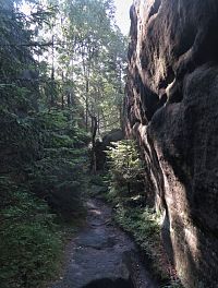 Následující úsek byl již na skalní útvary docela chudý, ale o to více to bylo nahoru-dolů, s různými schody a úseky hůře schůdnými. Někteří členové výpravy proto jasně dávali najevo jistou nelibost a úplně je neuklidnilo ani pár pěkných skalek v závěrečné části naší trasy. Počasí ale – naštěstí – vydrželo, časově jsme na tom také byli slušně, a tak jsme se ještě rozhodli udělat si zastávku v Polici nad Metují. Odměnou nám byl na chvíli zpřístupněný interiér kostela Nanebevzetí Panny Marie, jehož klenotem je ovšem románský až velmi raně gotický ústupkový portál z konce 13. století, ke kterému jsme si ještě přidali klášterní nahlédnutí, hřbitovní kapli Narození Panny Marie a procházku centrem čtyřtisícového městečka. A protože bylo jasné, že za chvíli začne pršet, zašli jsme rovnou do Ostaše na pozdní oběd. A tady jsme rovnou začali spřádat náš předběžný nedělní muzejní plán, protože bylo naprosto jasné, že den, kdy ani Bůh nepracuje, bude skutečně tím dnem z hlediska počasí nejškaredějším.