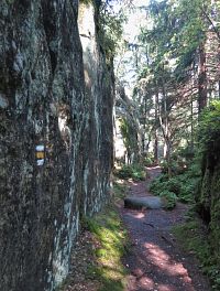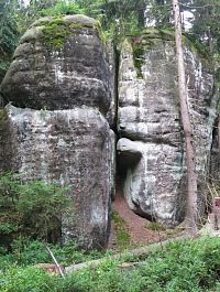 Zmíněným skalním městem už nás opět prováděla TZ žlutá a my si postupně prohlédli např. Veverku, Kočku, Varana, Kačenku, Velblouda nebo Želvu. Následoval krátký úsek po zelené, opětovný přestup na žlutou a potom jsme již směřovali kolem Čertova sedla a Koruny ke skalnímu útvaru Kamenná brána. A na ni jsem se těšil opravdu hodně, čímž jsem ovšem možná na svou hlavu přivolal neštěstí. Nešlo ovšem ani tak o nevhodné osvětlení (poloha „nebeské lampy“ prostě byla jasně daná), ale spíše o to, že se zde právě nacházela jedna velmi početná rodina (snad až 10 ks), která se fotila ve všech možných číselných variantách a kombinacích, tedy po jednom, ve dvojicích, ve trojicích atd. Pro nás ostatní se tedy možnost udělat si slušnou fotku stala oříškem téměř nerozlousknutelným a bránu jsme opouštěli s pocitem jistého neúspěchu. Za vidění však tato krásná přírodní „stavba“, která je jedním z hlavních symbolů Broumovských stěn, rozhodně i tak stála.