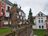 K autu jsme došli za přijatelného mrholení a protože se k večeru docela vyjasnilo, trávili jsme závěr dne opět v areálu broumovského kláštera. Potom ještě na chvilku do Lokálu, kde nám zapůjčili luxusní talíře (v nedalekých apartmánech totiž chyběly, stejně jako např. tekuté mýdlo v koupelnových zásobnících). Tím nám také na chvíli skončila dovolená a začal normální víkend. Sobota 26.7.2025 pak měla být dnem zasvěceným převážně sakrálním památkám v čele se zástupci slavné skupiny broumovských kostelů …