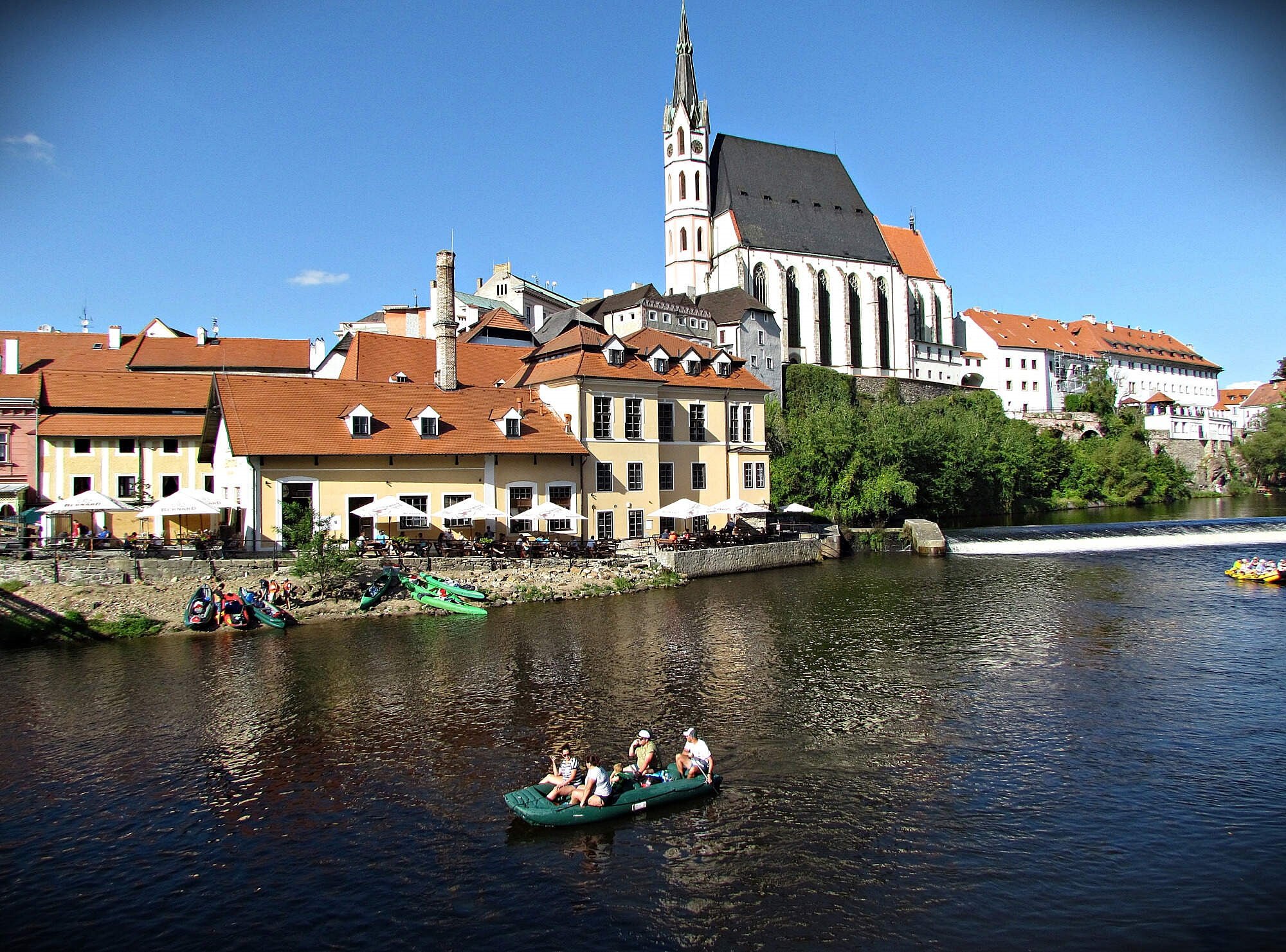 To pak opravdu nevíte, na co koukat dřív. Jestli na nádhernou kulisu návrší se zástavbou památných měšťanských domů, často přeměněných na hotely, penziony a restaurace, nad nimiž se impozantně zvedá masa chrámu sv.Víta s vysokou věží... anebo na to neutichající hemžení na hladině Vltavy, kde se pod Mrázkovým jezem otačejí vory naložené pasažéry a mezi nimiž se proplétají skuteční vodáci, sjíždějící na svých plavidlech řeku.