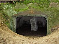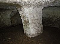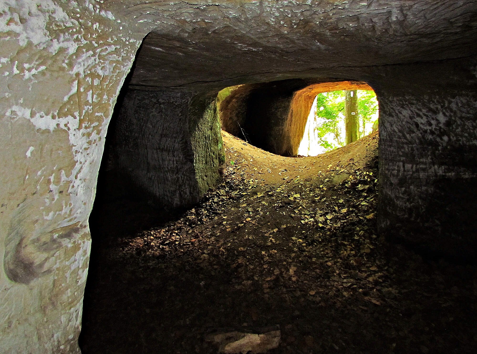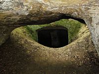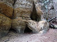 Zprava jej lemovala skála nahrazující hradbu, jíž by musel zbudovat člověk a vlevo vystupovalo kupovité skalisko s ústím široké tajemné chodby vedoucí do jeho nitra. Nedlouhý tunel mne záhy přivedl opět na denní světlo - na dno vyrubaného příkopu, po jehož obou stranách kdysi vedly na vrcholovou plošinu schůdky. Stejně jako bývalou, prý až 35 m hlubokou hradní cisternu, je za dlouhá staletí překryla sesutá zemina. Následoval „zlatý hřeb“ v podobě návštěvy tajemné a poměrně rozsáhlé skalní světničky, členěné středovým pilířem. Díky vestavěnému blesku jsem si ji konečně mohl pořádně vyfotit a za jeho použití se mi díky příblesku podařilo pořídit i několik celkem zdařilých snímků prostory spolu s přilehlým tunelem.