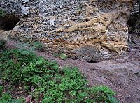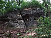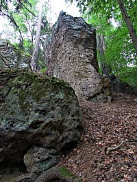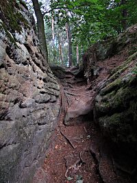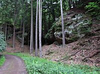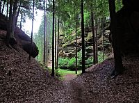 Asi po půlkilometru chůze byla levá strana rokle najednou lemována souvislou a členitou skalní stěnou dosahující výše asi 10 m, která byla vskutku názornou ukázkou kvádrovitého rozpadu a selektivního zvětrávání pískovců. Napravo odbočoval do boční lesní rokle chodník, procházející na začátku divokou soutěskou. Některá skaliska se mohla pochlubit opravdu fantaskními tvary... a když si zpětně tuhle lokalitu v hlavě promítnu, můžu říct, že se jednalo o nejpůsobivější skalní seskupení v celém dlouhém úseku ústřední rokle.