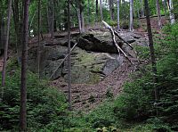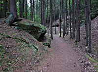 O něco dál zpevněná komunikace odbočila vlevo a červená trasa pokračovala lesní cestou dále roklinou. I tady byly okolní svahy obohaceny o další zajímavé ukázky neživé přírody, jenže se již nevyskytovaly v tak hojném počtu a byly i mnohem menší. Při závěru suché dolinky se cesta zmrskla na šířku pouhé pěšiny, provedla mne krátkou soutěskou mezi svislými stěnami dvou ohromných balvanů, a pak chodník vystoupal na hřeben s lesní silničkou a tur.rozcestím „U Hynšty.“ Byla tu umístěna i lavička, a tož jsem se na ni posadil a při odpočinku chvíli rekapituloval vědomosti o tajemném skalním hrádku, který za chvilku opět po dlouhé době spatřím na vlastní zraky. Díky článkům na internetu i nově popsaným objevům vědomosti v mé hlavě nabyly na rozpínavosti a vyplnily dříve prázdné mozkové dutiny.