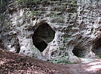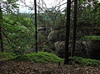 Červená značka pokračovala dál velkým pravotočivým obloukem do mírného svahu, a kdybych tu byl poprvé a předtím nekoukl do mapy, vůbec bych netušil, že se zrovna nacházím zhruba v geografickém středu Příhrazského skalního města. Jakýmkoliv výhledům do okolí totiž brání vzrostlý les. Po chvilce jsem minul rozcestí s modrou značkou vedoucí pod protějším protáhlým skalnatým hřebenem k Hrázce, ale jelikož mé nožky tudy už před lety kráčely, mozek si pamatoval, že na této zkratce nic moc k vidění není. Proto zvolena cesta mírnou zacházkou po červené až k tur. rozcestníku „U Věže“, vzdáleném jen pár minut chůze. Asi po 150 m se silnička oddělila směrem vpravo a já dál mírně sestupoval po lesní cestě. Vlevo se ve svahu objevily první shluky nižších mrazových srubů a skalek, které příchozí zaujmou hlavně bizarně modelovanými stěnami a množstvím kulovitých dutin. Napravo pak zor na horní část rokle, která ale není součástí Vlčího dolu a je jen slepou odbočkou.