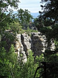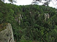 U tur.rozcestí „U Věže“ jsem dal vale červené, která skalním městem (v posledním úseku dokonce po dlouhém schodišti) klesá dolů do Příhraz a přestoupil na žluté značení, které sem zezdola od obce vystoupalo. Dál už mne čekala velmi pohodová a přitom velmi atraktivní procházka. Žlutá trasa se v mnoha zákrutách (ale tady už jen po vrstevnici) vinula lesní cestou nad okrajem vysokých stěn lemujících od jihu ústřední proláklinu Příhrazského skalního města s roklí Krtolou. Cesta sem tam minula ústí roklin spadající do hlubiny, jenže kvůli hustému porostu byly výhledy na protější vzdálené skalní stěny dosti sporadické.