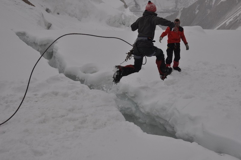 První aklimatizační výstup 5.8.2010. Vyrážíme na lehko ve 3h. Teplota kolem 0°C, ale po ledovci se jde dobře. Nástup i po tmě nalézáme v pohodě a začínáme stoupat. Práce jde překvapivě dobře od ruky, cesta je značená trasírkami. Asi po dvou hodinách vstupujeme do obrovského laviniště (lavina padla asi tři dny před naším příjezdem) a jí pokračujeme pod séraky ve výšce cca 4700m. Po prošláplém chodníčku postupujeme do výšky 4900m, kde potkáváme sestupující „rychlou rotu“ s vyčerpaným, motajícím se Pašíkem. Odlehčujeme mu batoh a společně sestupujeme. Cesta do C08 je úmorná, zase peče slunce. Ve stanu je i po odizolování 30°C a není kam utéct. Ztrácím chuť k jídlu. Co půl hodiny s rachotem padají laviny z okolních vrcholů.