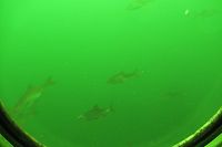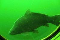 Stále drobně prší, v kabině bude naštěstí sucho. V tomto nečase jsme tady jediní návštěvníci. Limit pro pobyt v kabině je běžně 10 minut, ale my dnes prý pospíchat nemusíme. Dostali jsme skoro cca 0,3 - 0,4 l krmeni pro ryby, které máme nasypat na hladinu. Než slezeme, bude pomalu padat dolů a lákat ryby. Jdu jako první, samozřejmě s přestávkami. Až když jsem dole, sype Ota krmení a slézá. Zpočátku vidím malé rybky, ale když krmeni spadlo, je tu spousta dalších ryb, velcí kapři, sumci, dokonce jsme zahlédli i jednoho jesetera. Zkoušíme fotit, ale moc to nejde, okénka na některé velké ryby jsou malá, ryby jsou rychlé. Je to však skutečně zajímavé. Vloni jsem sem chtěla vzít vnoučata, ale syn mi to rozmluvil. Nebyl si jist, že tehdy pětiletá Karolínka by ten žebřík zvládla. Jsem ráda, že jsem ho poslechla. Myslím, že na ty dětské nožičky jsou stupně docela vysoké. Dolů jsem lezla pomalu, ale nahoru jsem skutečně měla co dělat. Na těch 4 metrech jsem odpočívala každou chvilku - zvlášť v té druhé polovině. Měla jsem co dělat se dostat nahoru a pak na tu plošinu. Ale líbilo se mi to moc.
