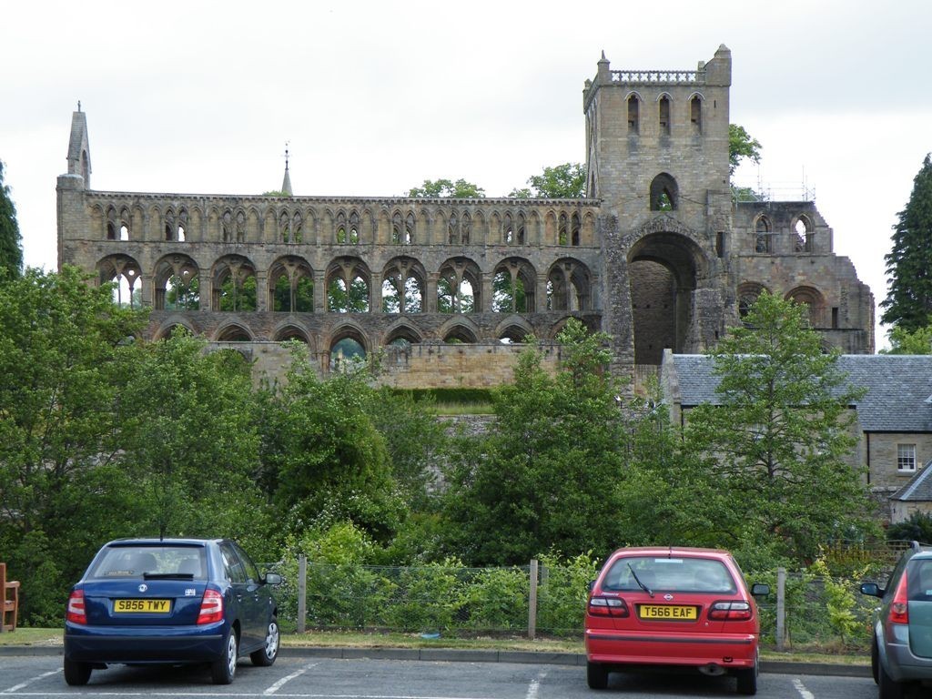 13.6. Po 60 km se stavujeme v Jedburghu. Cestou jsme překročili konečně hranice Skotska. Možná to sem byla zbytečná zajížďka. Sice je tu zajímavá zřícenina kláštera (5,2Ł), bohužel zavřená. Nevylučujeme, že kvůli opravě. Třeba jsme tu příliš časně. Ale na pěkném parkovišti by se dalo přespat. I zde jsou pěkné WC zavřeny. Celkem je tu dost mrtvo. Tak jsme se ani nešli podívat na hrad a jedeme do 80 km vzdáleného Edinburghu. Budeme mít aspoň trochu čas na hlavní město Skotska.