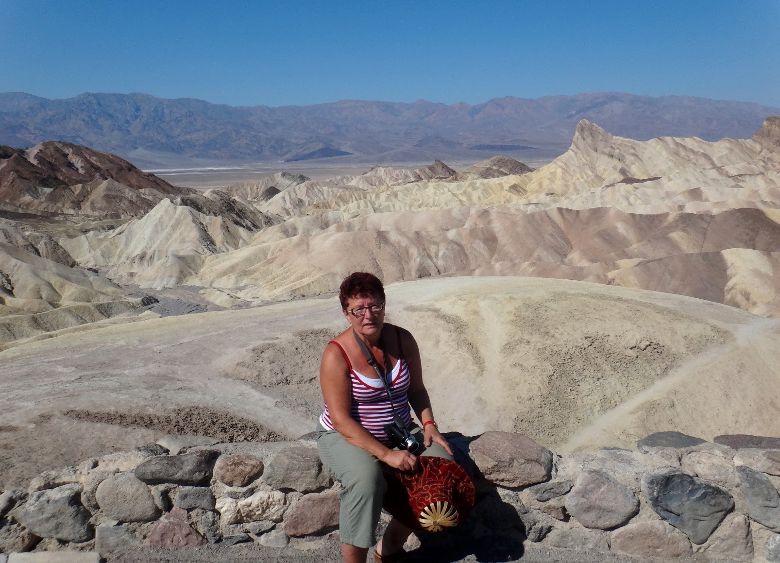 To už přijíždíme k hlavnímu cíli dnešního dne, k místu zvanému Badwater. Od parkoviště jdeme vyšlapanou cestou přes nejžhavější solné pole, v dáli jsou vidět hory. Před mnoha miliony let zde bylo 10 m hluboké jezero, dnes se toto místo nachází 85,5 m pod úrovní moře a je to nejteplejší místo na světě. Upozorňuje na to nápis na skalní stěně. My v říjnu jsme tam byli téměř v pravé poledne a bylo tam 46 st.Celsia. Povrch země je ale daleko více rozpálený než vzduch. Rukou se země nemůžete skoro dotknout, v minijezírkách je téměř vařící voda. Nedalo nám to a půdu i vodu jsme prstem vyzkoušeli. Přestože je zde nejsušší a nejžhavější místo i zde se vyskytují rostliny. Naše procházka tam i zpět v této rozžhavené výhni trvala asi půl hodiny a rádi jsme se uchýlili do klimatizovaného auta. Přesto ale dojem z tohoto místa byl jedinečný.