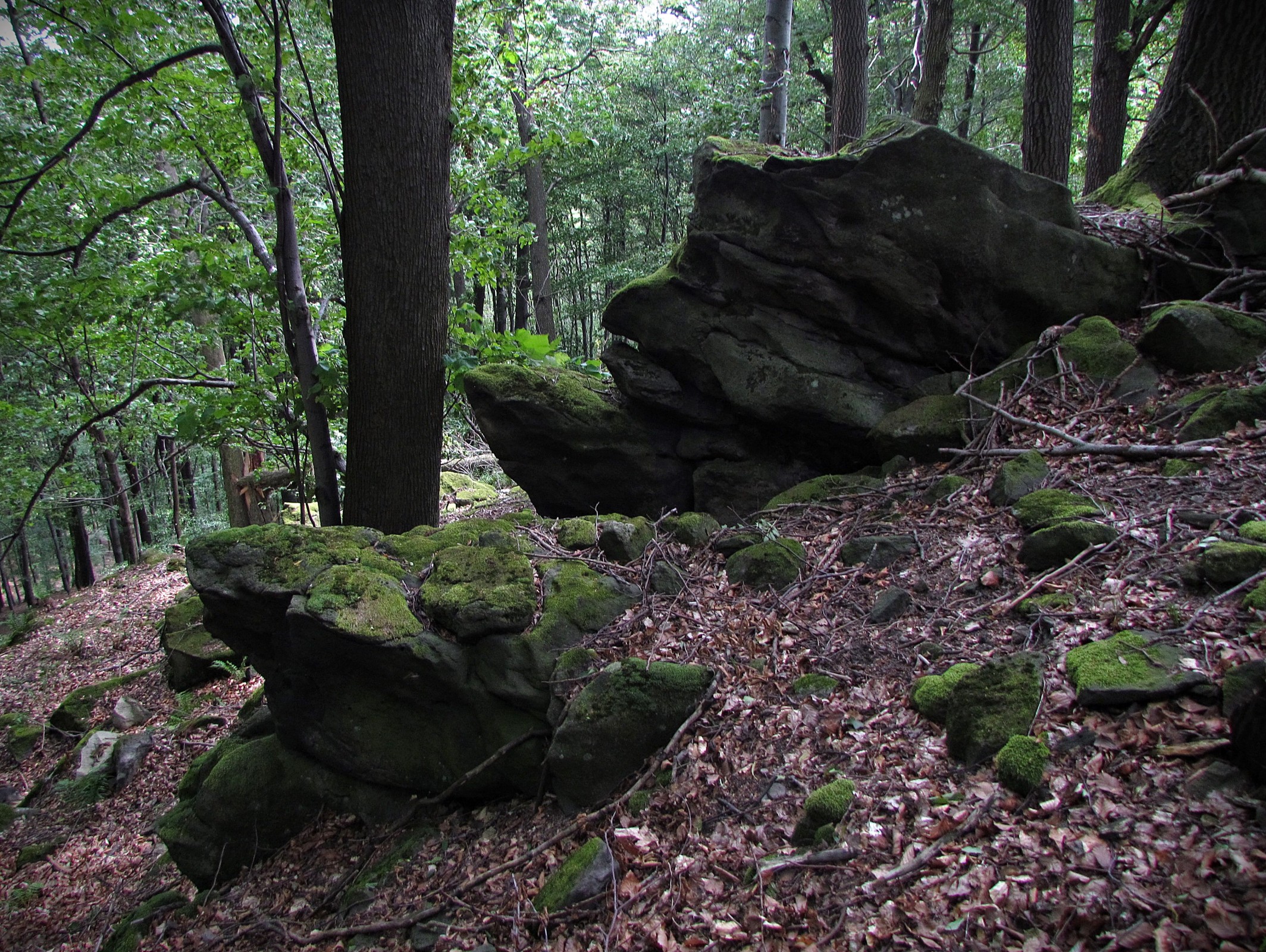Náš původní plán - pokračovat odsud k Rajnochovicím po chodníčku po hřebeni, má zádrhel: v bujném porostu není jeho pokračování nikde vidět! Jelikož máme strach z nenažraných a krvelačných klíšťat, scházíme z vrcholku raději cestou necestou lesem až na tu lesní cestu s přeloženou červenou tur.značkou. Cesta se sice záhy mění jen v široký chodník, ale i ten nás velmi pohodlně vede po vrstevnici po úbočí hory okolo zajímavých, chobotnicovitých kořenů lesních buků. Poté přicházíme na ohyb hory, kde se znovu setkáváme s tabulí PR Skaliska Sochová. Ona totiž byla r.2003 rozšířena z původních 2 ha na dnešních 16.5 ha a k chráněné ploše přibyl vlastní vrchol Sochové a východní skalnatý strukturální hřeben. Já pak na něm (k mé velké radosti) vidím v divočině horského lesa také nějaké skalky. A protože ty zatím nejsou označeny na žádné mapě, letím je prozkoumat. A má radost je navýšena o poznatek, že to nejsou ždáné skalky, ale minimálně 10 m vysoké stěny mohutných mrazových srubů!! Po průzkumu se vracím za Janou, ale když naše značka zabočí táhlým obloukem do údolíčka pod skalními stěnami a já vidím dál na hřebeni další, ale už nižší mrazové sroubky, lezu v teniskách (!) do svahu na průzkum ještě jednou...