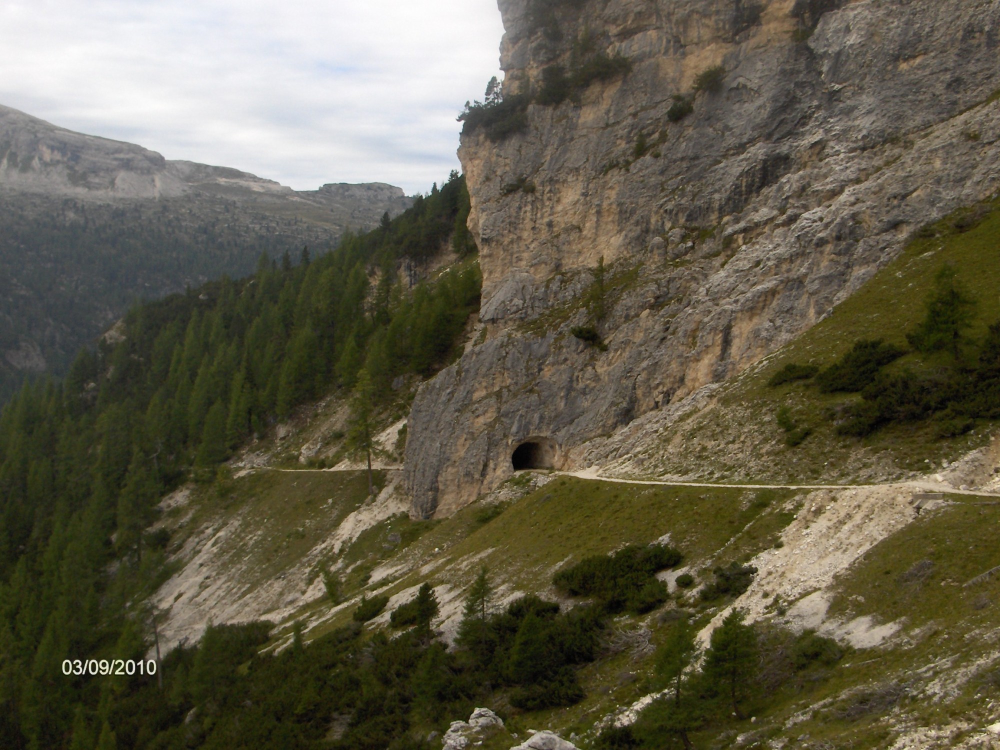 Zaparkovali jsme kousek pod sedlem Falzarego na odpočívadle Ra Nona /1985 m/ u Velké dolomitské cesty. Od chaty začíná uzoučká stezka lesem č.412. Stoupá ke staré vojenské cestě Col dei Bos, která v zákrutech stoupá pod stěnu Tofany di Rozes. Procházíme vysekaným tunelem ve skále, který v I. světové válce sloužil jako úkryt a stáj pro koně. Na rozcestí Rozes /2176 m / odbočujeme a cestou 412 Sentiero Sotecordes střídavě nahoru a dolu lesem docházíme na rozcestí Valon de Tofana /2103 m/. Odtud to je malý kousek na chatu Dibona /2083 m/. Chata byla ještě zavřená a tak po krátkém odpočinku na terase pokračujeme cestou 421 prudkým výstupem na chatu Dibona /2303 m/. Kam jsme došli za tři čtvrtě hodiny. Je začátek září a sezona pomalu končí a tak i zde se chata teprve probouzí k životu. Je poledne a přesto, že lanovka z Cortiny jezdí, sešlo se nás zde 5. Z terasy chaty se otevírá krásný pohled do údolí s Cortinou d´Ampezzo, na skupinu Sorapis, Cristalo a na protilehlé Cingue Torri, Groda da Lago. Od chaty začíná známá závodní sjezdovka.