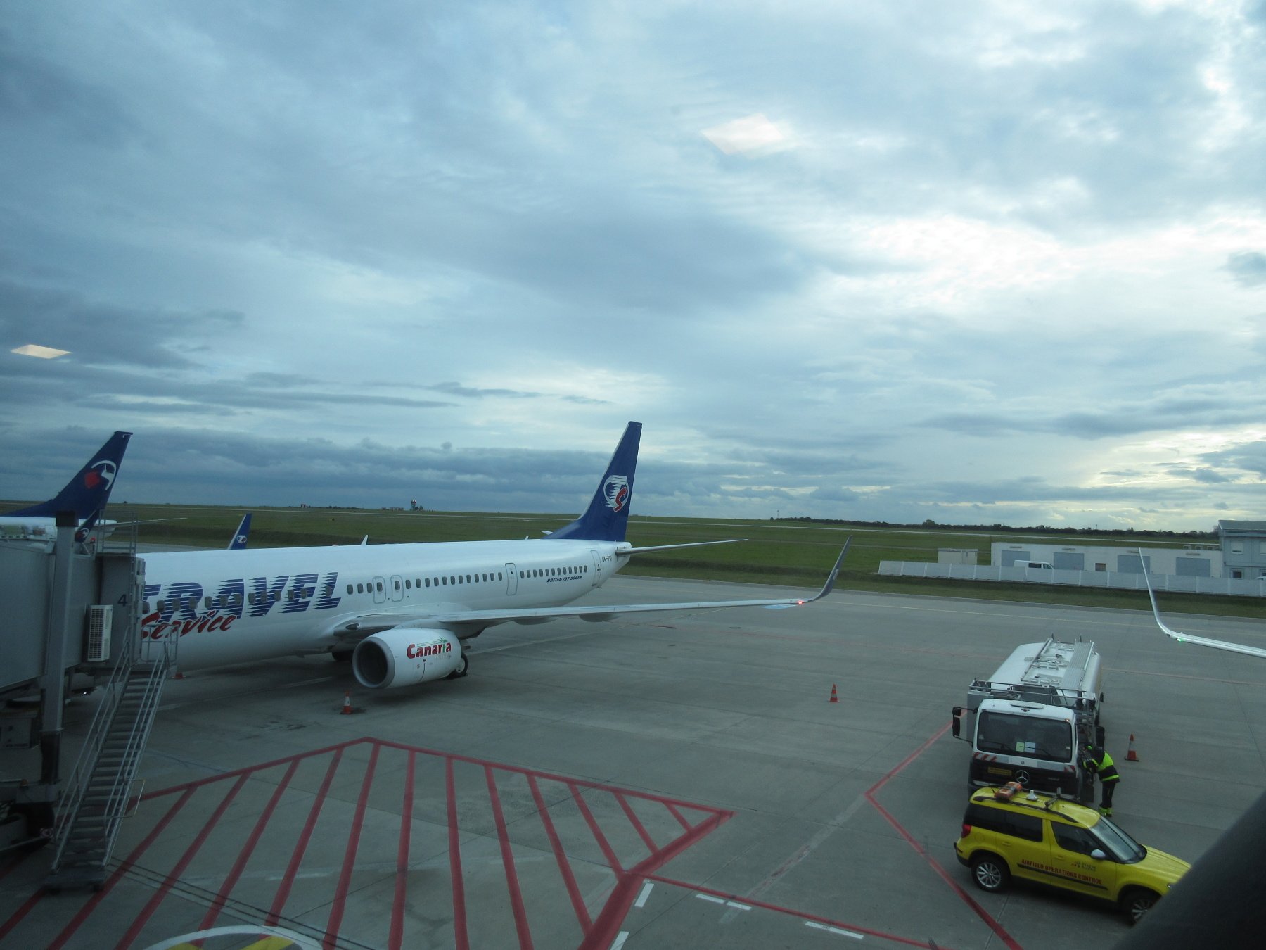 Vzhledem k tomu, že se vracíme poměrně pozdě v noci – až před 23. hodinou, kdy už není žádné spojení do Plzně, rozhodli jsme se jet autem. Otův syn nám nabídl, že nám půjčí kartu, abychom mohli zdarma parkovat na letišti. Ještě že jsme všude raději s předstihem. Z domova jsme vyjeli v 11 po staré silnici, protože dálniční známku nemáme. Hlavně proto, že nás nebaví po dálnici jezdit. V Žebráku jsme si dali svačinku - sekanou v housce a pokračovali na letiště. Na druhý pokus jsme našli parkoviště, kam jsme měli zajet. Jenže ono to tak jednoduché nebylo. Kartu nám to vzít nechtělo, resp. vzalo a zase vyplivlo, napsalo nám to: couvněte, závora se otevře. A to bylo vše. Zkoušeli jsme druhý vjezd - se stejným neúspěchem. Ota tak dlouho něco mačkal, až nám to vyplivlo lístek a závora se otevřela. Na lístku byla naše SPZ a čas vjezdu. To už jsme věděli, že je něco špatně. Rozhodli jsme se parkoviště opustit. A znova zkusili kartou závoru zvednout. Tentokrát nám to kartu už nevrátilo. Takže další průšvih. To nám to pěkně začíná. Voláme od závory do zdejší kanceláře, kde nám úřední hlas oznámil, že jsme na černé listině a že se máme dostavit do kanceláře. Situaci jsme nakonec vysvětlili, z parkoviště nás dokonce pustili bez placení, i když to nejdřív vypadalo na 50,- Kč. Ale to bychom ještě přežili. Jen kartu si tam nechali. Naštěstí jsme měli času dost, syn byl v práci a měl zrovna volno, přijel pro nás, odvezl nás na veřejné parkoviště, které je v dosahu MHD, a zavezl i s batohy zpátky na letiště.