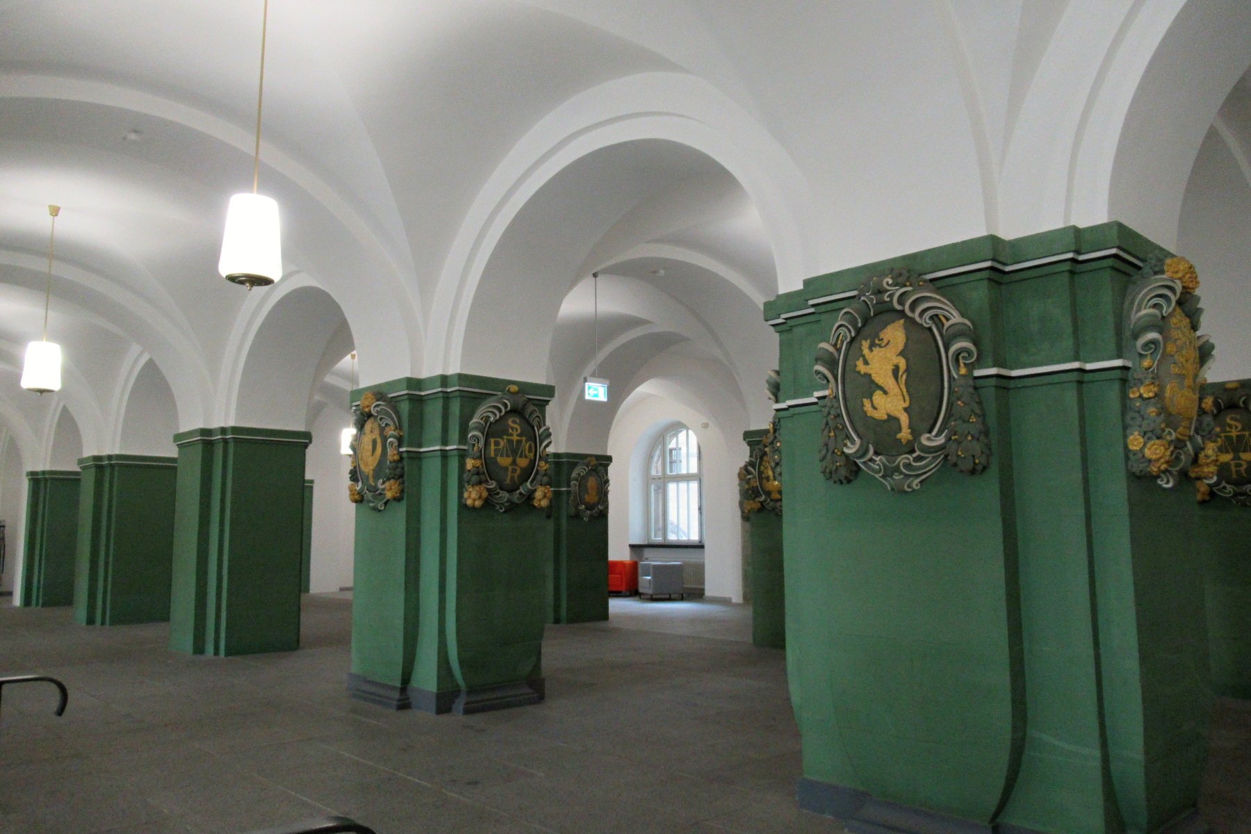 Začíná se samozřejmě u radnice. Byla postavena na místě středověké předchůdkyně v letech 1905–1910. Při náletech v únoru 1945 byla budova těžce poškozena. Od r. 1948 probíhala rozsáhlá rekonstrukce. Objekt byl dokončen r. 1952, ale křídlo tanečního sálu bylo přestavěno až v letech 1962 - 1965. V letech 2011 - 2016 proběhla další rekonstrukce tohoto křídla a do původní podoby byla z velké části obnovena i Zlatá brána, která je hlavním vchodem do objektu. Zvenku ji hlídají 2 radniční lvi. Je to obrovská stavba, která zaujímá celý blok. Zajímavý je i do zelena laděný interiér. Tam nás sice průvodkyně nevedla, ale já se pokoušela tam najít toalety. Díky plánku, který je jen kousek od vstupu, se mi to podařilo.