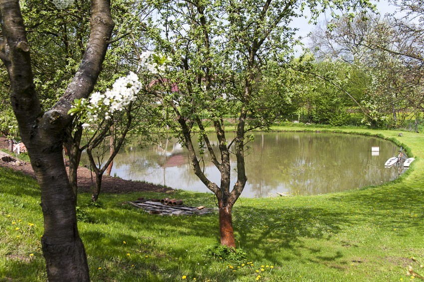 Večerní hýření bylo v mezích slušnosti, tak jako obvykle vstáváme s Markem mezi prvními. Kupodivu velice brzy se objeví i čerstvě dorazivší zbývající trojice (že se jim chce vstávat někdy ve 4 ráno). Nic tedy nebrání včasnému vyjetí. Tomu ovšem předchází obligátní společné foto. Směr je pro mě už jasný – na Ostružno, tudy jsem včera přijel, pak do Dolního Lochova, kousek po hlavní cestě (kolem nedávno přejetého srnce). Směr Blata, Zámostí. Sice by to bylo kousek do skal, ale ty přijdou později. Při následující jízdě se promícháme s nějakou místní skupinou (z Jičína), po malém váhání je následujeme do Hubojed. První zastávka v osadě Plhov, kde ke svezení láká svérázné vodní kolo. Odvážlivci jsme se našli dva. Přestože má kolo blatníky, moc proti ostříkání nebrání, proto musím opatrně. Mladší Marek do toho šlapal víc (a je i víc zamokřený).