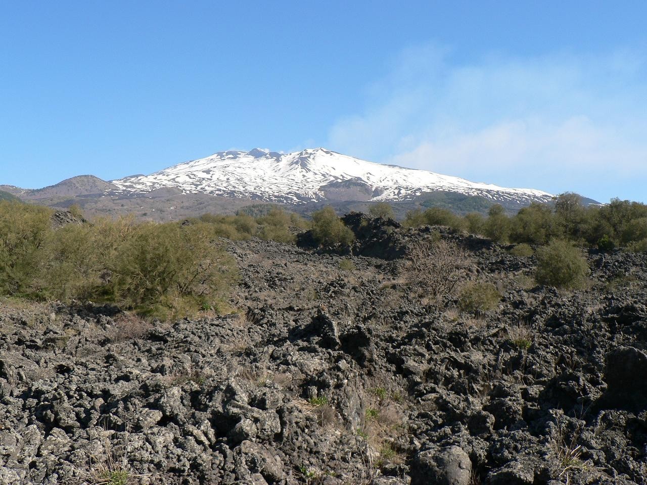 Vydat se k vrcholu Etny začátkem dubna je zhola nemožné, ale alespoň se jí dotknout je natolik lákavé, že se rozhodujeme pro výlet autobusem, který pořádá naše cestovka. Po více jak hodině jízdy se proplétáme Catanií a za městem se nám Etna objevuje v celé kráse. Při prvním zastavení se seznamujeme s tmavým lávovým polem, na kterém sem tam rostou keře janovců. Je odtud hezký pohled na jižní svahy Etny, ale opačným směrem je vše hodně zamlžené. Autobusy již šplhají po úzké, zřejmě jednosměrné silnici vzhůru. Sněhu přibývá a v některých místech převyšuje i autobus. Konečně zastavujeme na parkovišti. Jsme přibližně ve výšce kolem 2000 m.n.m. Jsou tu doslova davy turistů, kteří míří k nedalekým, tak zvaným „ turistickým kráterům“.
