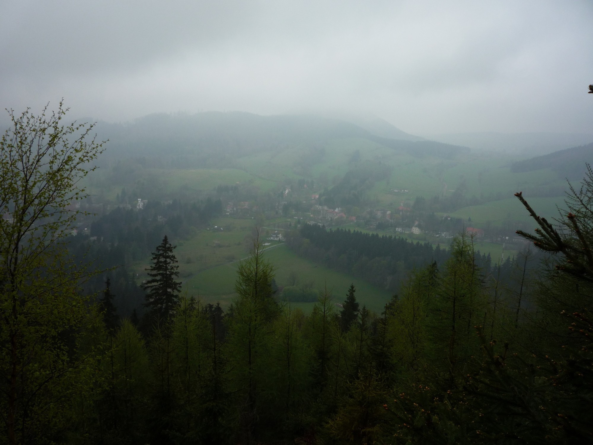 Ráno už nepršelo a vypadalo to, že bude hezky. Přes sedlo Trzech Dolin jsme po vrstevnici došli k hranici, odkud jsme vystoupali na Ruprechtický špičák. Z této strany byl sice taky prudký, ale nebyl vysoký. Rozhledna nám poskytla výhled na okolní kopce i Soví hory, vše částečně schované v mracích. Cesta po české straně Javořích hor nám připomněla, že Ruprecht umí být velmi vysoký a vyčerpávající. Ještě že jsme šli dolů. Z lesa jsme vylezli u Pomeznice a po krásných loukách jsme přes Vižňov došli do Meziměstí.