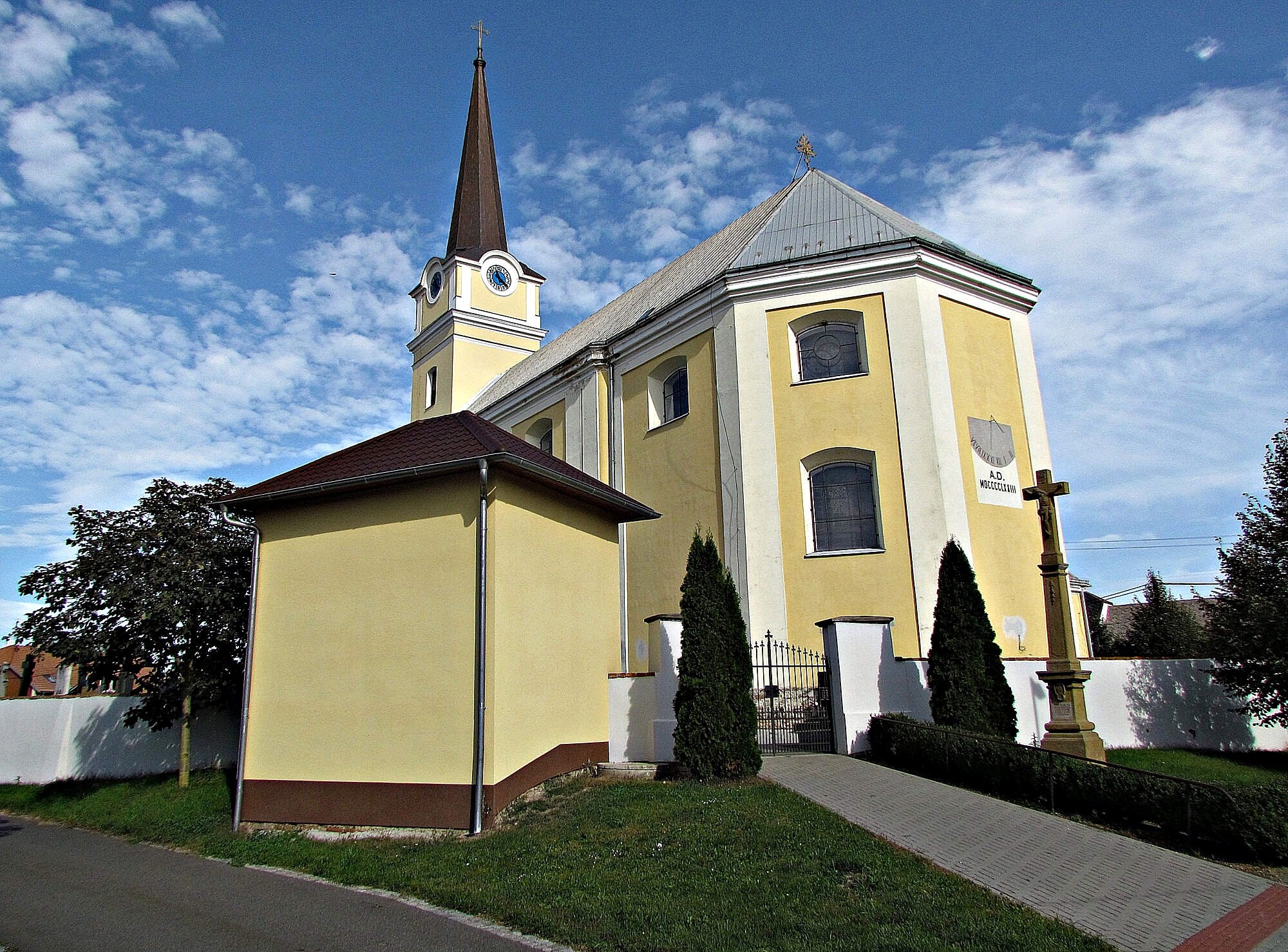 (Věž byla ke kostelu přistavěna až roku 1886 a díky své výšce 51 m se rázem stala hlavní dominantou obce. Kostel dosahuje celkové délky 34 m, šířky 11 metrů a od roku 1973 jeho fasádu krášlí i sluneční hodiny.
