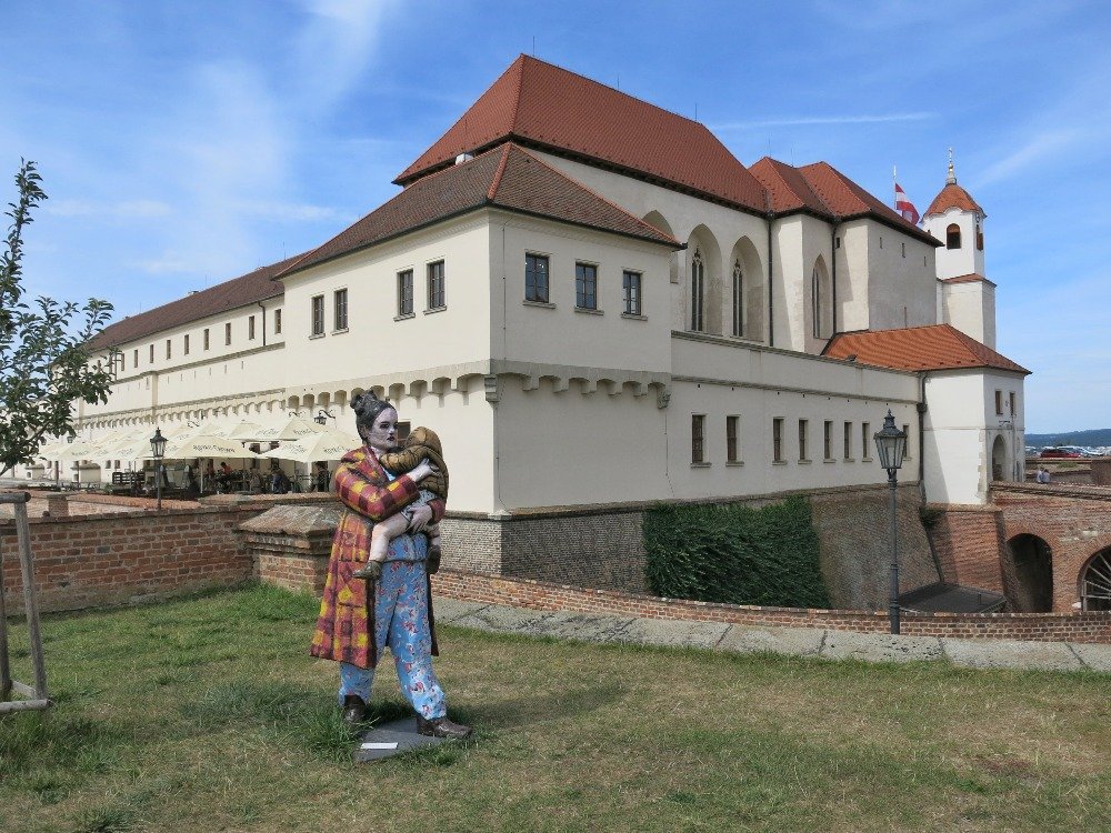 Původně jsme tady chtěli prolézt kde-co-všechno, ale nakonec jsme náš program výrazně okleštili, abychom se nepřehltili a schovali si něco i na příště. Z bohaté nabídky různých prohlídkových okruhů a muzejních expozic jsme nakonec zvolili jen Královskou kapli (je to víceméně novostavba, do které se chodí koukat hlavně na vitráže z počátku 21. století) s rozhlednou (prostě jsme z horní části Špilberku panoramaticky pohlédli na Brno pod námi a byli až zaskočeni monumentálností mrakodrapu zdejšího finančního úřadu). Cestou dolů jsme se pak ještě zastavili u bicyklu, na kterém bratři Pospíšilové svého času získávali jeden titul mistrů světa v kolové za druhým.
