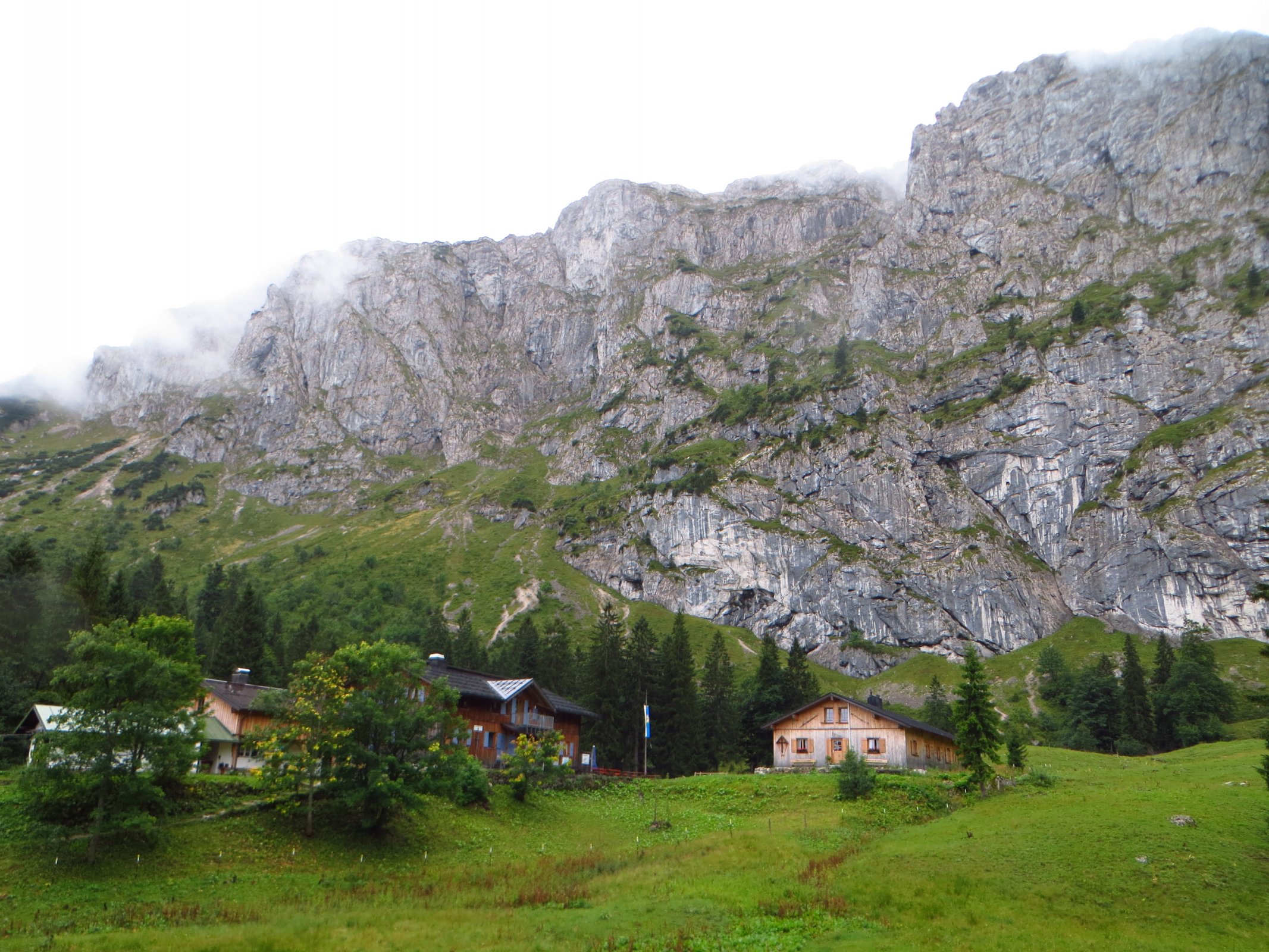 Míjím chatu Probstalmhütte a Edelweiß-Hütte a ještě dál by měla být restaurace Hintere Längentalalm. Venku stojí několik stolů s lavicemi a dva slunečníky, takže usoudím, že to asi bude chata, kdy bych si mohla dát další čaj a vezmu za kliku. Je odemčeno, ale když se podívám dovnitř, zase chci vycouvat, připadá mi totiž, že jsem vlezla k někomu do kuchyně. Stojí tam stařičký sporák, dřevěné skříně a jeden velký stůl, kolem kterého sedí devět babiček ustrojených jako do kostela, vypadá to, že se sešly na nějakou oslavu. Desátá babička stojí u sporáku a ptá se mě, co jsem chtěla. Říkám "čaj". Tak mi ukáže na desáté místo u stolu a jde mi postavit vodu na čaj. Devět babiček kolem stolu si mě chvíli zvědavě prohlíží a jedna z nich řekne nějakou větu, na jejímž konci poznám slova "es regnet" (prší), takže přikývnu a odpovím "ja, es regnet". Pak už si mě nevšímají. Vypiju si svůj čaj, zaplatím za něj stejnou cenu jako v předchozí chatě (nemyslím si, že by tady měli nějaký ceník nebo pokladnu) a jdu zase dál.