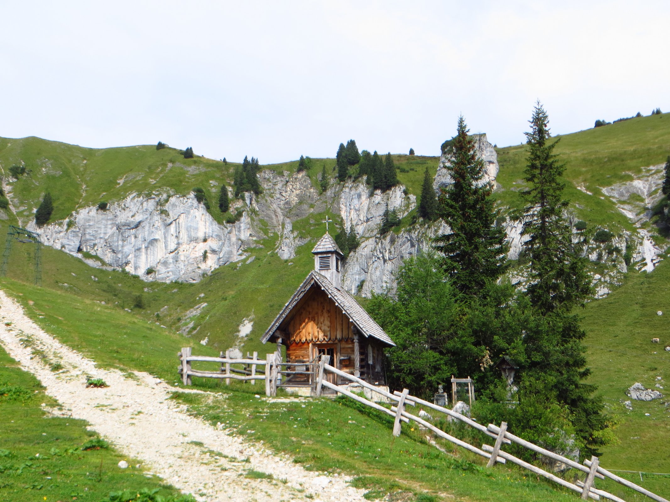 Výhled na chatu Tölzer Hütte, v pozadí krásné panorama Alp, vpravo se mlžně rýsuje Zugspitze