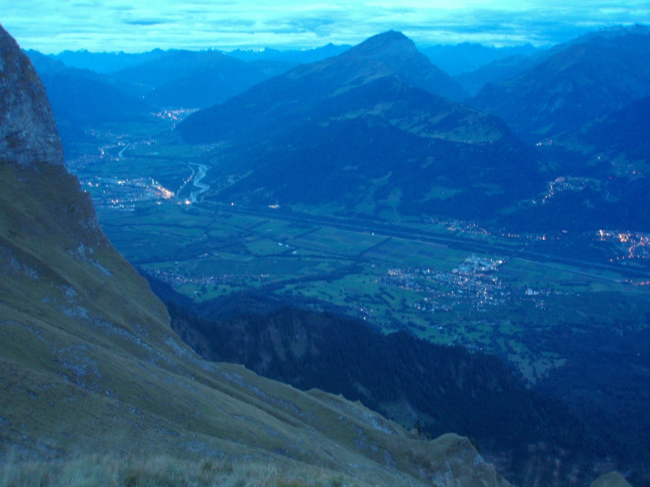 Studujeme ještě jednou ukazatel směrů a mapu. Zkoušíme také telefonovat, ale kluci mají mobilní aparát vypnutý nebo jsou bez signálu. Pozorujeme krajinu dole pod námi, která je rozdělena řekou na dvě části lišící se od sebe tím, že jedna je krásnější než druhá a druhá je úžasnější než ta první. Horská panoramata násobí úchvatný a nezapomenutelný pohled do údolí Rýnu. Určitě by se zde dalo toulat a poznávat zajímavá místa, ale nás čeká celkem náročný sestup na švýcarské území a poté přesun zpět do Lichtenštejnska. Původní plán je tudíž odložen, jelikož by to bylo časově náročné.