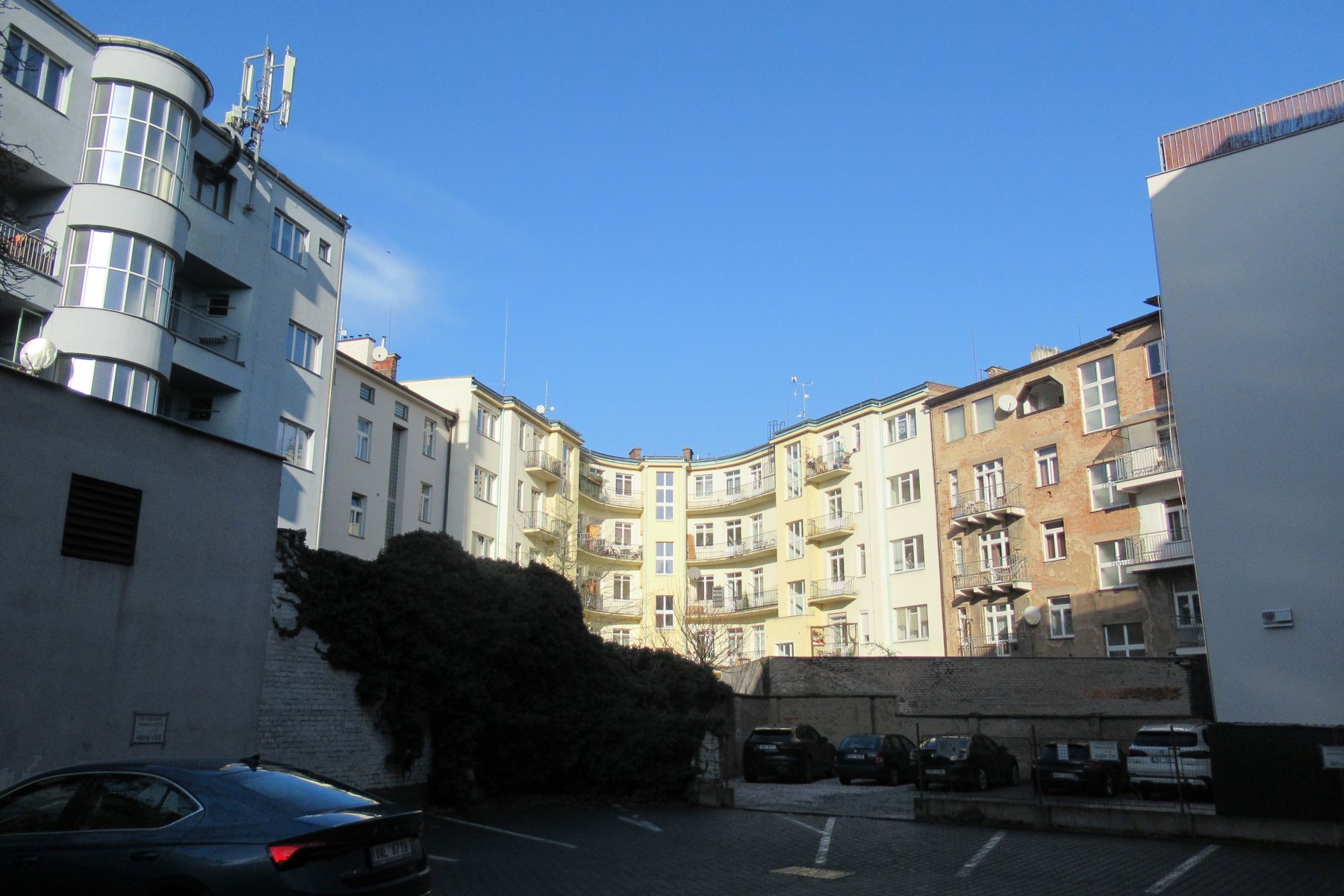 Proti nám je velká historická funkcionalistická budova, postavená v letech 1936 - 1938 podle návrhu Jana Reichla jako armádní velitelství. Ještě než se tam stačila armáda nastěhovat, obsadilo ji gestapo a během 2. světové války zde mělo svůj štáb. Dnes zde sídlí lékařská fakulta.