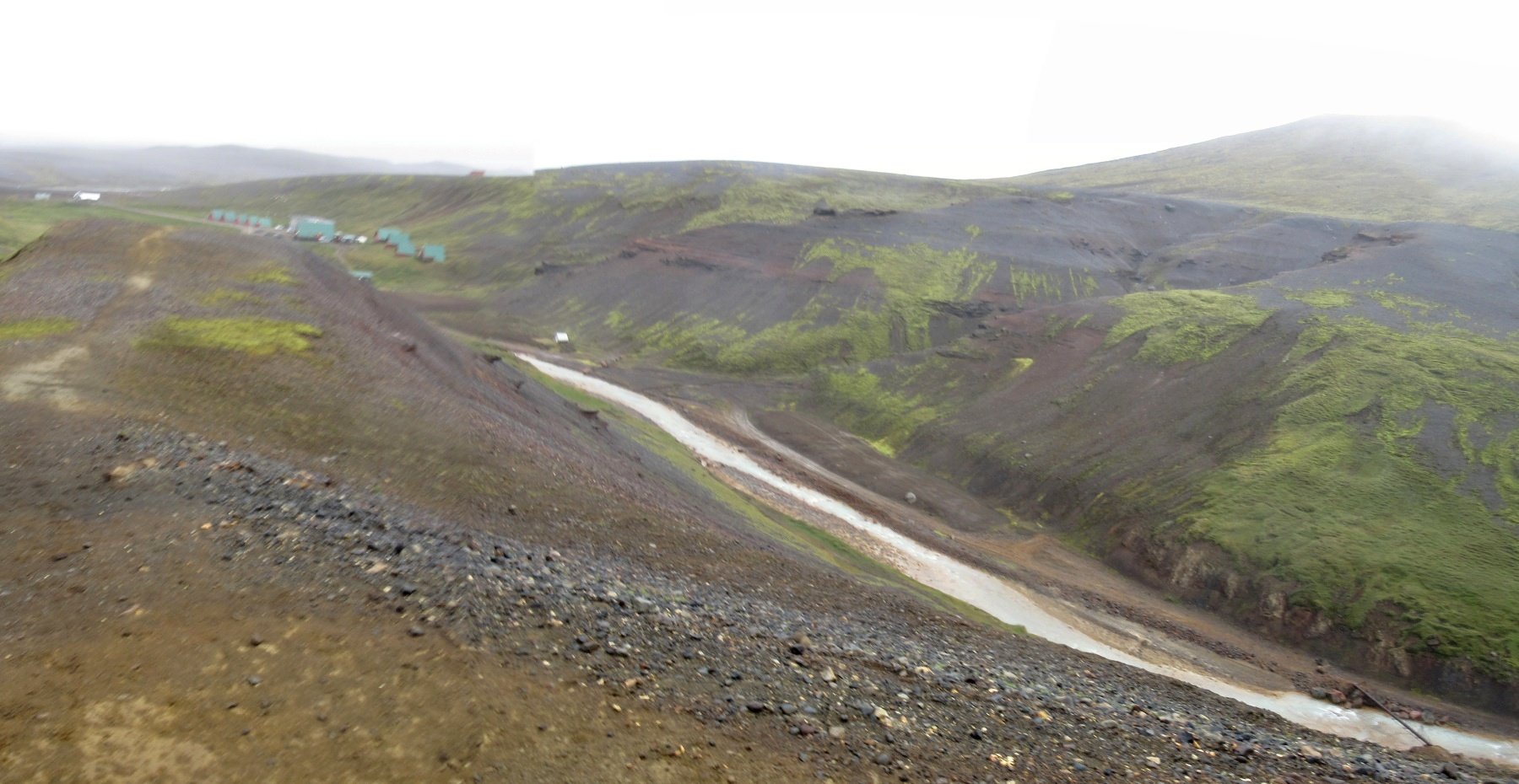 Kdo je na chatě Aðalskáli ubytovaný, dostane se z tohoto parkoviště zpátky k chatě pěšky po prašné silnici - je to jen kousek do kopečka a pak už převážně z kopečka. Je to sice dalších asi 6 km, ale na trase je vyhlídka do tohoto krásného údolí. A hlavně, už se nejde v jílu.