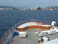 Toto soukromé štěstí ještě umocňuje vyhlídka na pestrou snídani po návratu na loď. Ta každé ráno za cinkání příborů v restauraci vyplouvá do dalšího atraktivního bodu, aby naplnila úsloví „Krása střídá nádheru“. Plavba za dne má řadu výhod: na dvou terasách se lidé mohou kochat krásnými výhledy na pobřeží, vyfotit si řadu majáků a ze souše těžko dostupných míst, slunit se na lehátkách, poslouchat muziku, relaxovat či v klimatizovaných kajutách dospávat včerejší noc. Houpání jachty na vlnách člověka příjemně ukolébá a díky dostatečné velikosti lodi není třeba se bát mořské nemoci. Komfort polopenze obnáší snídani a tříchodový oběd, jednu kapitánskou večeři, denně litr vody na osobu a také Wi-Fi na palubě. V baru na lodi si lze koupit další nealkoholické i alkoholické nápoje. Občas je zastávka ke koupání v pěkných místech, kdy posádka spustí k hladině žebřík ze spodní paluby. Méně zkušení plavci mohou v moři využít jisticí lana a záchranné kruhy. O účinku kouzelných vod Jadranu není třeba se rozepisovat, stačí se jen ponořit a nechat se omývat – anebo si z lodního vybavení půjčit brýle se šnorchlem a vypravit se na průzkum. Nejodvážnějším poslouží vrchní či prostřední terasa jako skokanský můstek, a to už je pořádný adrenalin!