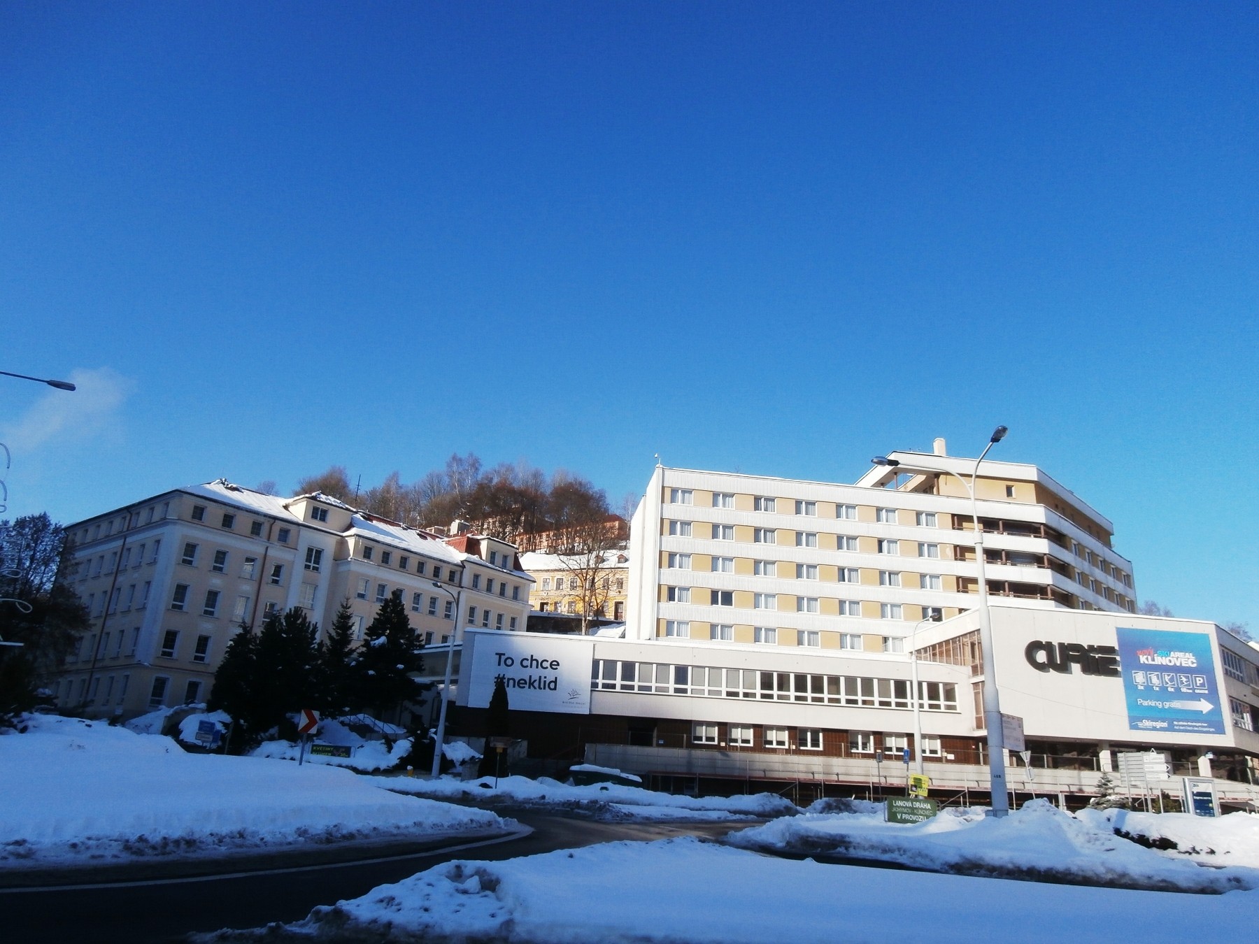 Vstupní „procedurou“ na recepci a dalšími úkony, které následovaly po ní, Vás ale unavovat nebudu! Jen mě udivovalo to velké množství sněhu všude okolo, které u nás v Teplicích nebylo! Výhled ale okolo lázeňského domu „Curie“ byl úžasný! Po jedné straně se zdvíhal do výše lázeňský dům „Akademik Běhounek“ a ještě než jsme zaparkovali u našeho lázeňského domu, projížděli jsme okolo monumentálního lázeňského domu „Radium palace“. Byl to nádherný dům!!! Kdysi jsem v něm byla před mnoha a mnoha lety navštívit tetu, která se tu léčila. Tehdy tu ještě fungovalo vlakové nádraží a z něj to bylo k tomuto „Radium paláce“ jen kousek. No, časy se mění, co bylo, už dávno není…Dnes po vlakovém nádraží není ani památky a Doprava se zajišťuje autobusy, anebo pendlbusy na objednání.