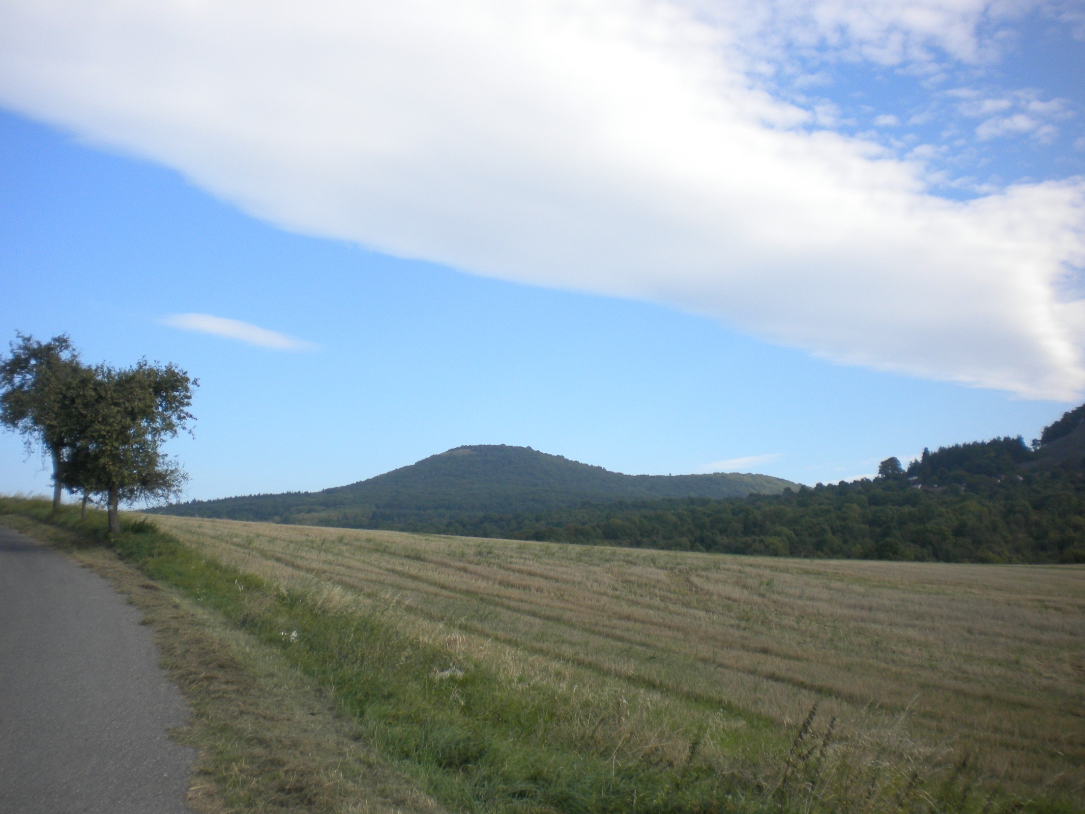 Tak jsem se pomalejší jízdou dostal až do vsi Skalice, kde mě na chvíli čekalo i malé klesání, ale pak dále jsem opět musel zase stoupat. Už to ale nebylo tak hrozné. Ovšem to ,,vydrápání se“ až sem nahoru se vyplatilo. Od Skalice se tu rozprostírají hezké výhledy do kraje. Výhledům tu ale opět dominuje Solanská hora. Co je ale také hlavní, je tu klid a provoz téměř žádný. Při mé další jízdě od Skalice směrem na Kocourov po silnici podobné nějaké polňačce jsem se dostal na začátek klesání. Mě tu ale místo klesání opět zaujaly překrásné výhledy. Můžete zkusit uhodnout, kdo se objevil přede mnou. Hradišťany (752 m.n.m.), druhá nejvyšší hora Českého středohoří. Kromě Hradišťan se na mě dívala i Lipská hora (689 m.nm). Její tvar je velmi podobný tvaru nejvyšší hory Českého středohoří Milešovce. Dále jsem viděl i Lovoš a v dáli se z mlhoviny vynořovaly dokonce Krušné hory.