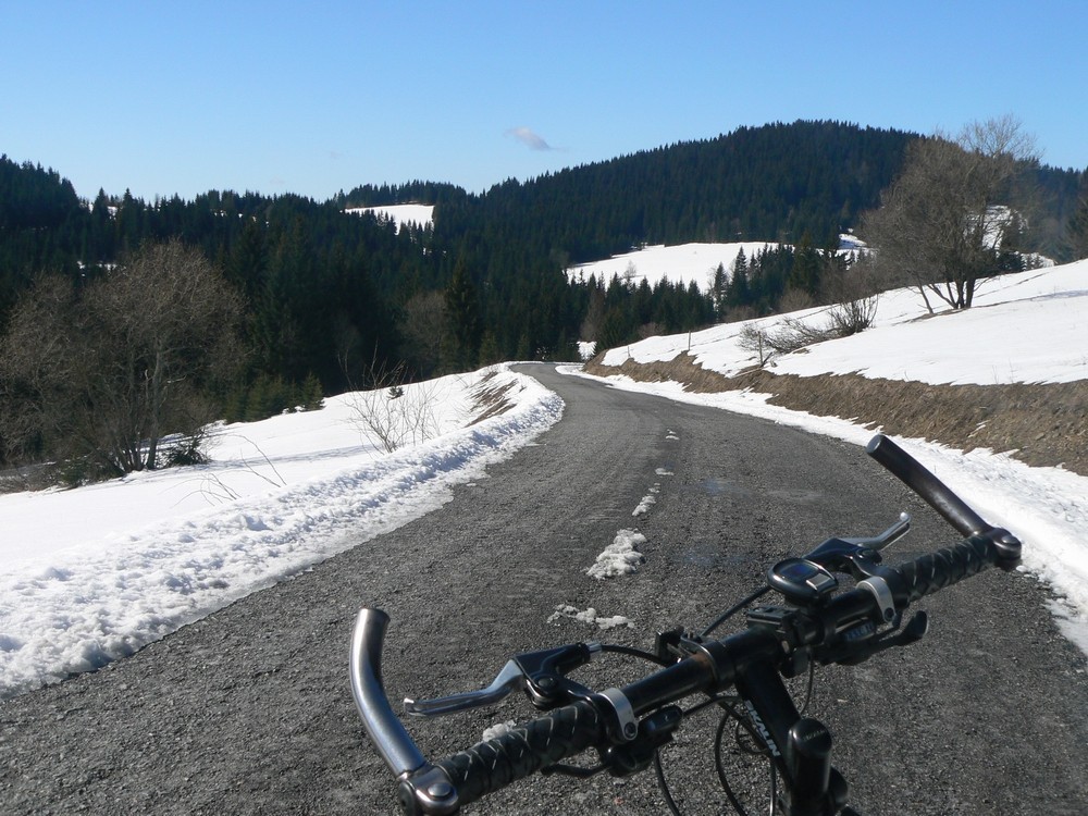 Obvyklý obrázek ze stoupání na Demänovou - část silnice vyhřívá sluníčko a hned vedlejší část je pokrytá ledem