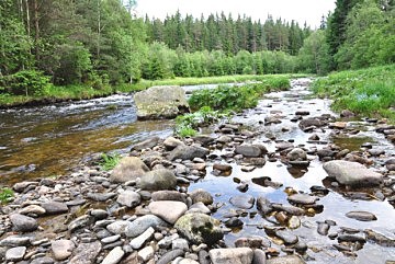 Chvíli sedíme pod turistickým přístřeškem a kromě sušenek spořádáme všechno jídlo, co neseme s sebou. Zpět k autu je to necelé dvě hodinky klidné chůze. Jdeme totiž zkratkou po cestě, která od Stodůlek postupně klesá zpět ke Křemelné. U ní musím pro několik fotek přes mokřadní louku, ale stojí to za to. Temně hnědé dno kontrastuje dokonale se světlejšími, oblými balvany v řečišti a vytváří kulisu pravé kanadské divočiny. Pro tyhle chvíle, pro tato místa se sem stále rád vracím.