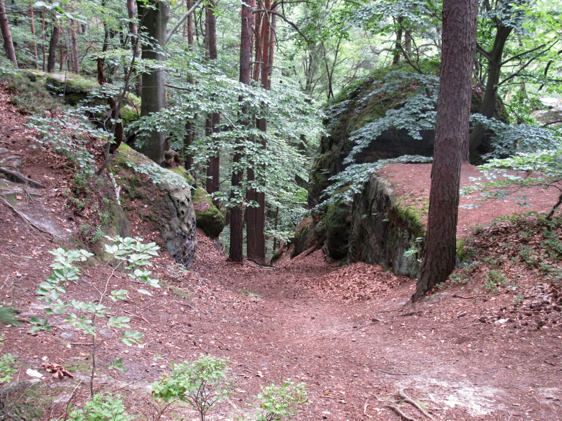 Také odpoledne se jdeme podívat na skály. Chceme si projít další část naučné Cinibulkovy stezky. Vede po silnici, to se nám moc nelíbí. Vracíme se kousek po cestě, po které jsme dopoledne přišli. Kde jsme ráno odbočovali vlevo, odbočujeme vpravo - opět po neznačené cestě a po chvilce opět vpravo a kopírujeme silnici. Najednou jsou vlevo opět skály. Za chvíli jsme i na naučné stezce, která klesá a klesá ještě víc. Nakonec jdeme po prudkých ve skále vyšlapaných schodech (i když dnes to schody už jen připomíná) a přidržujeme se řetězů. Já ožívám, Ota moje nadšení nesdílí. Je pravda, že sestup je dost náročný, na pískovci to klouže. Naštěstí jsem to i já zvládla bez pádu. Ještě jdeme párkrát nahoru a dolů a najednou jsme na rovině v lese, okolo nás jsou vysoké skály. Jako když jsme na skalním náměstí.