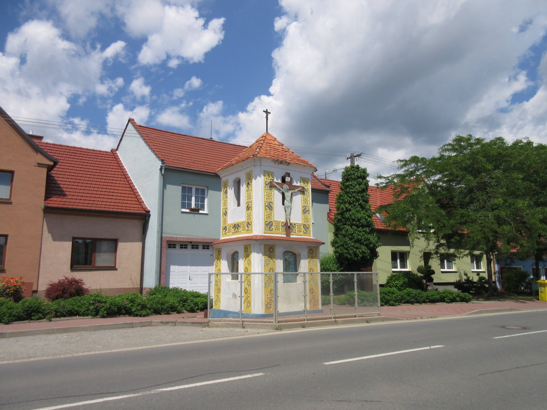 Je stále krásně teplo. Nakonec jsem ještě vyrazila se podívat k výklenkové kapli sv. Huberta, kterou jsme zahlédli u mostu. Není historická - byla postavena r. 2015. Ale je postavena na památném místě. Tady si prý předkové připomínali zrušení roboty r. 1848. Boží muka vandalové zničili a tak si zde postavili tuto kapli.