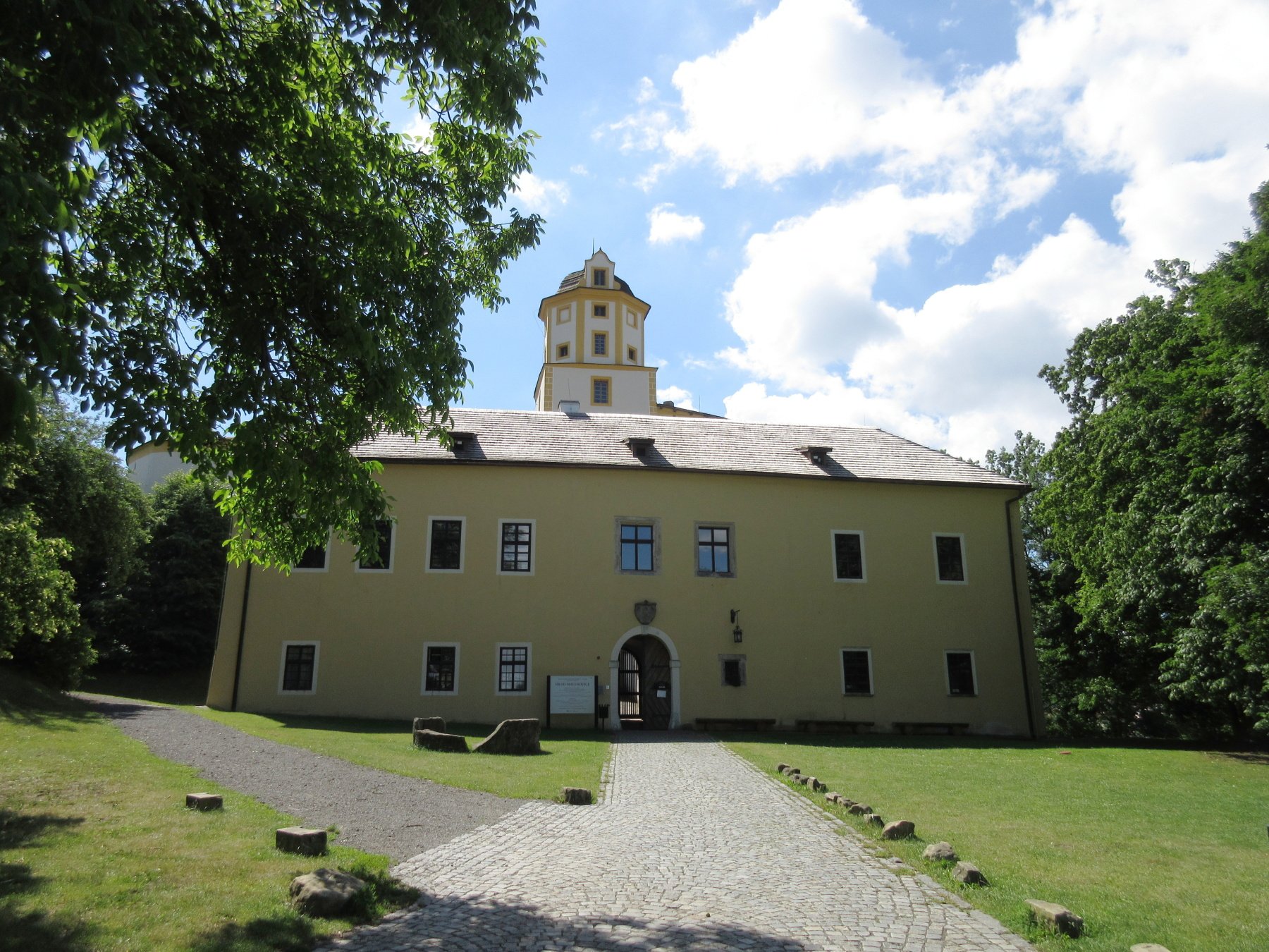 V 11 jdeme na prohlídku původně gotického hradu. Byl založen ve 2. pol. 14. století na západním výběžku Tlusté hory. Od okolí byl oddělen hlubokým a širokým příkopem. R. 1427 ho dobyli husité – v hradební zdivu jsou prý z té doby dvě kamenné koule. My je tam samozřejmě neviděli. V 1. pol. 16. století byly provedeny renesanční úpravy, nádvorní trakt byl doplněn renesančními arkádami. Za hraběte Františka Karla z Lichtenštejna po r. 1692 získal konečnou barokní podobu. Byly přistavěny nové obytné budovy s prostorným schodištěm a velkými okny. Hrad se snažili přizpůsobit tehdejším potřebám - vybudovali tak barokní zámek. Gotické prvky byly ponechány hlavně v kapli. V té době byl využíván jako letní rezidence.
