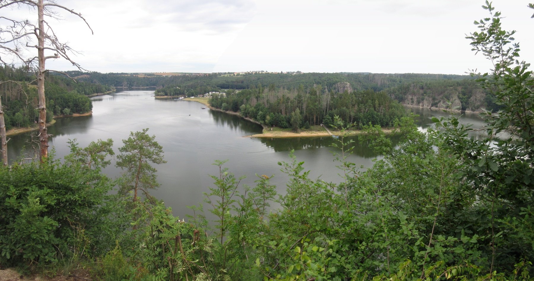V půl desáté odjíždíme. Ale jen kousek. Projíždíme Stropešínem a odbočujeme vpravo, kde na kraji obce u lesa parkujeme. Jdeme se podívat na Stropešínskou vyhlídku, odkud je vidět Dalešická přehrada. Pěšky je to už jen kousek. Vyhlídka je na skále a je moc hezky vidět na zákrutu přehrady – vlevo a naproti jsou pláže, vpravo nádherné a strmé skály.