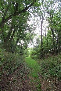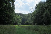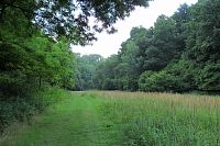 Najednou jsou tady opět značky naučné stezky. Do té rokle se asi nikomu nechtělo jít značky obnovit. Kus jdeme po zpevněné cestě, která se mění v zatravněnou cestu. Tu asi občas někdo projede sekačkou. Tráva je nízká. Tady je hezky. I Otovi se to tady líbí. Ale ještě mu chvíli trvá, než vstřebá ten příšerný kus cesty roklí.