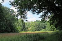 Stezka je tady dobře značená, vede nízkou travou. To jsem zvědava, kolik klíšťat doneseme. Obcházíme další nádrž s vodou, snad to bývalo i koupaliště, ale nezdá se, že by se využívalo. Stezka je věnována hlavně přírodě. Ve vodě žijí převážně obojživelníci a těm je věnována i hra pro děti - mají poznat, ke kterým dospělým obojživelníkům patří která larva a které vajíčko.