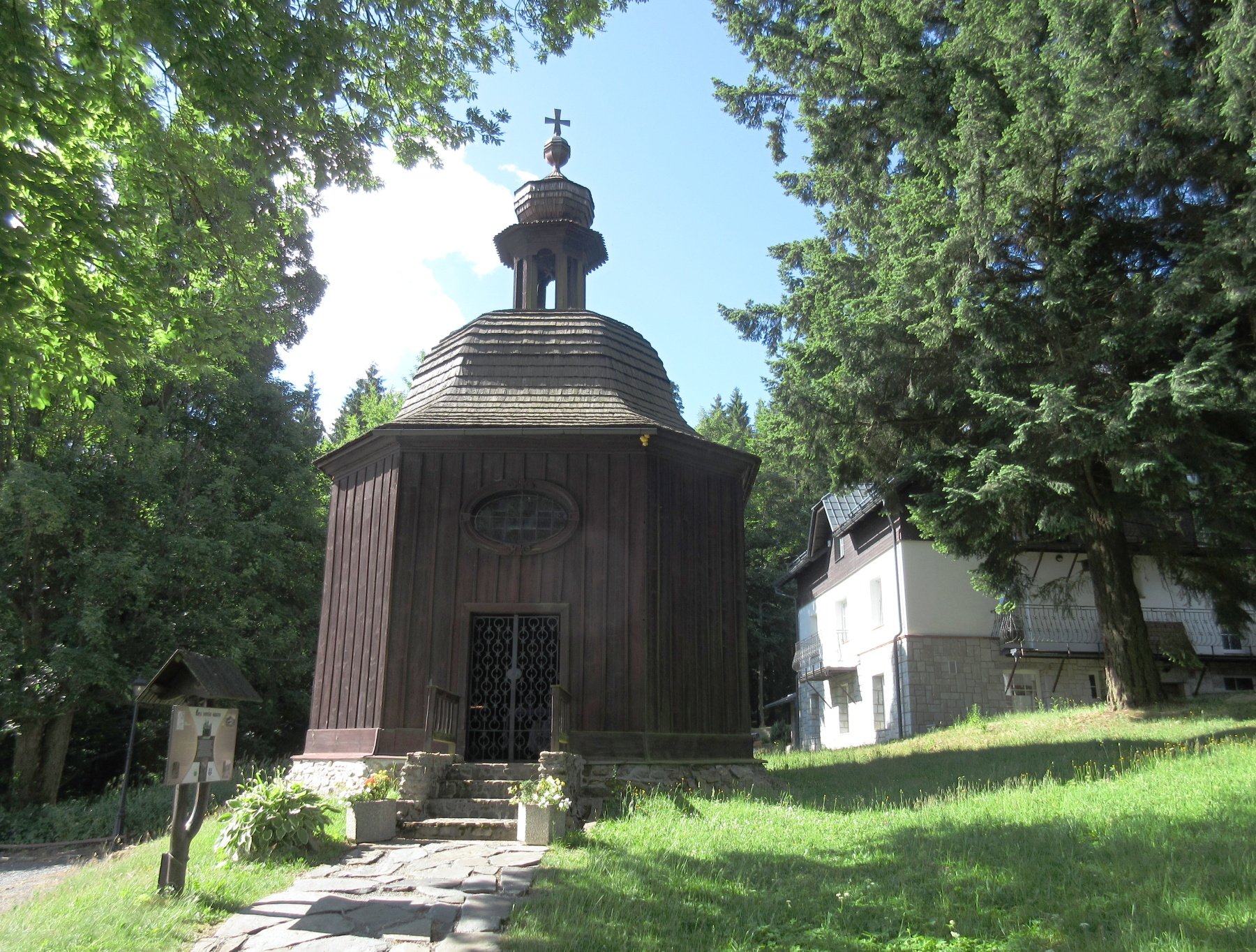 Zajíždíme do Karlovy studánky pro minerálku a při té příležitosti se jdeme podívat na malou dřevěnou osmibokou kapli sv. Huberta na západním okraji obce, kde jsme minule nebyli. Byla postavena pravděpodobně v letech 1757 – 1758. Stojí na kamenné podezdívce a je zakončena šindelovou zvonovitou střechou s lucernou, s cibulovou bání, makovicí a křížem. Nad oltářem je zavěšen obraz sv. Huberta z r. 1758. Na plochém stropu je obraz, který představuje hold venkovského lidu svaté Trojici. Na stěnách jsou zavěšeny obrazy malované na dřevě. Je vidět dovnitř, je to tam moc hezké.
