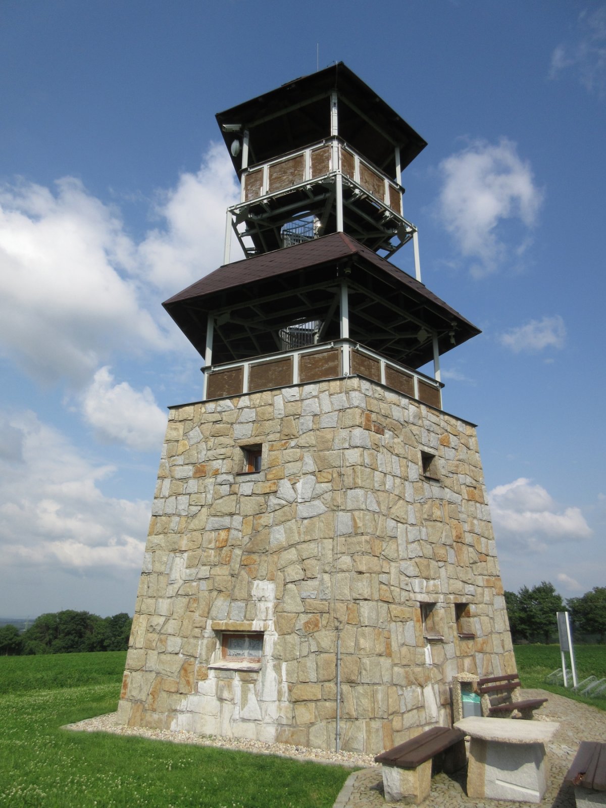 Rozhledny, které jsou součástí telekomunikačních stožárů, nemám moc ráda. Tahle je přece jen trošku jiná. Je čtvercového půdorysu, je vysoká 55 metrů, její spodní část do výše 17 metrů je obložena dřevem, takže vypadá docela dobře. Na vyhlídkovou plošinu ve výši 39 metrů vede 182 schodů. Jsou vidět vrcholky Železných hor, Žďárských vrchů, Orlických hor i Krkonoš.